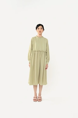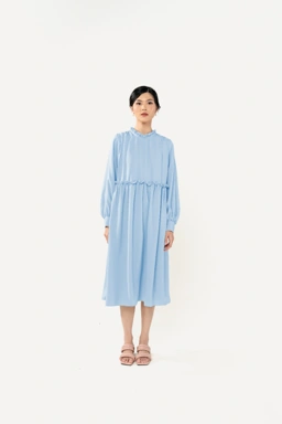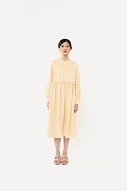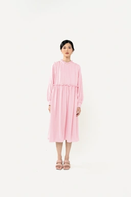 yang disertai detail ruffles dipadankan dengan lengan balon dan kerut pada