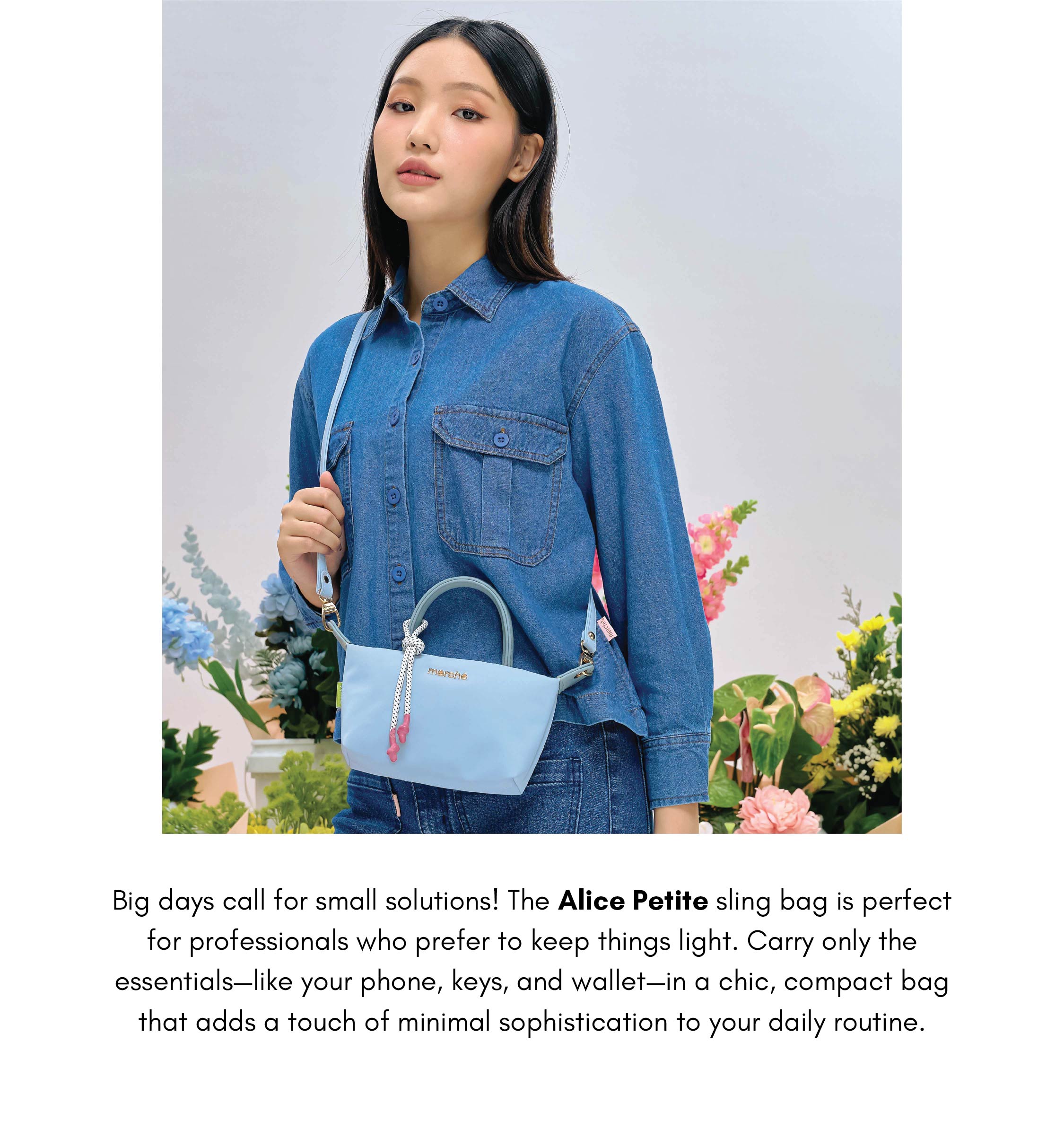 Big days call for small solutions! The Alice Petite sling bag is perfect for professionals who prefer to keep things light. Carry only the essentials-like your phone, keys, and wallet-in a chic, compact bag that adds a touch of minimal sophistication to your daily routine.
