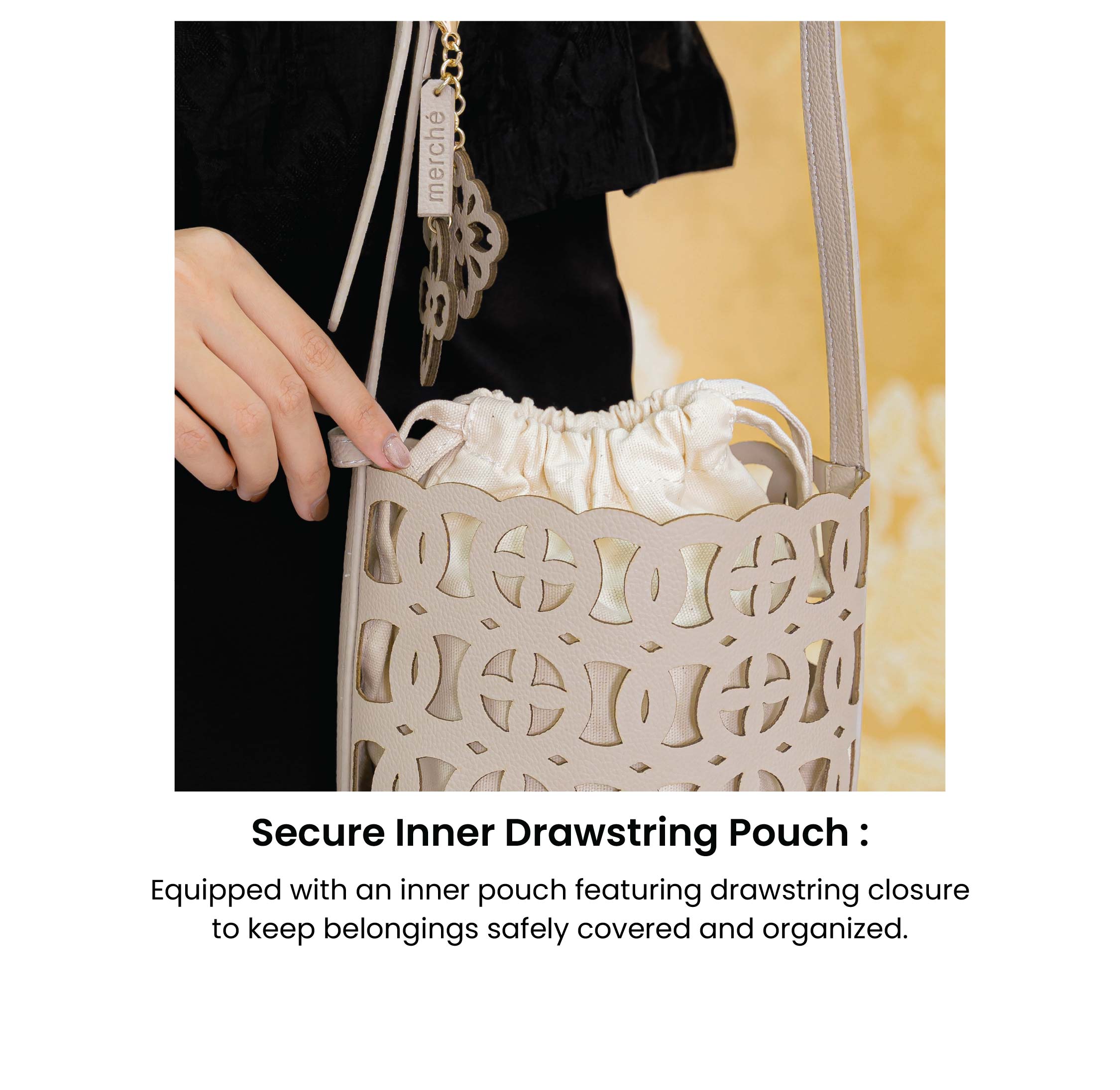 Introducing the exquisite Eve Bucket Bag, adorned with the intricate Cut Out Pattern Flower design, a stunning addition to this year's Flower Bliss