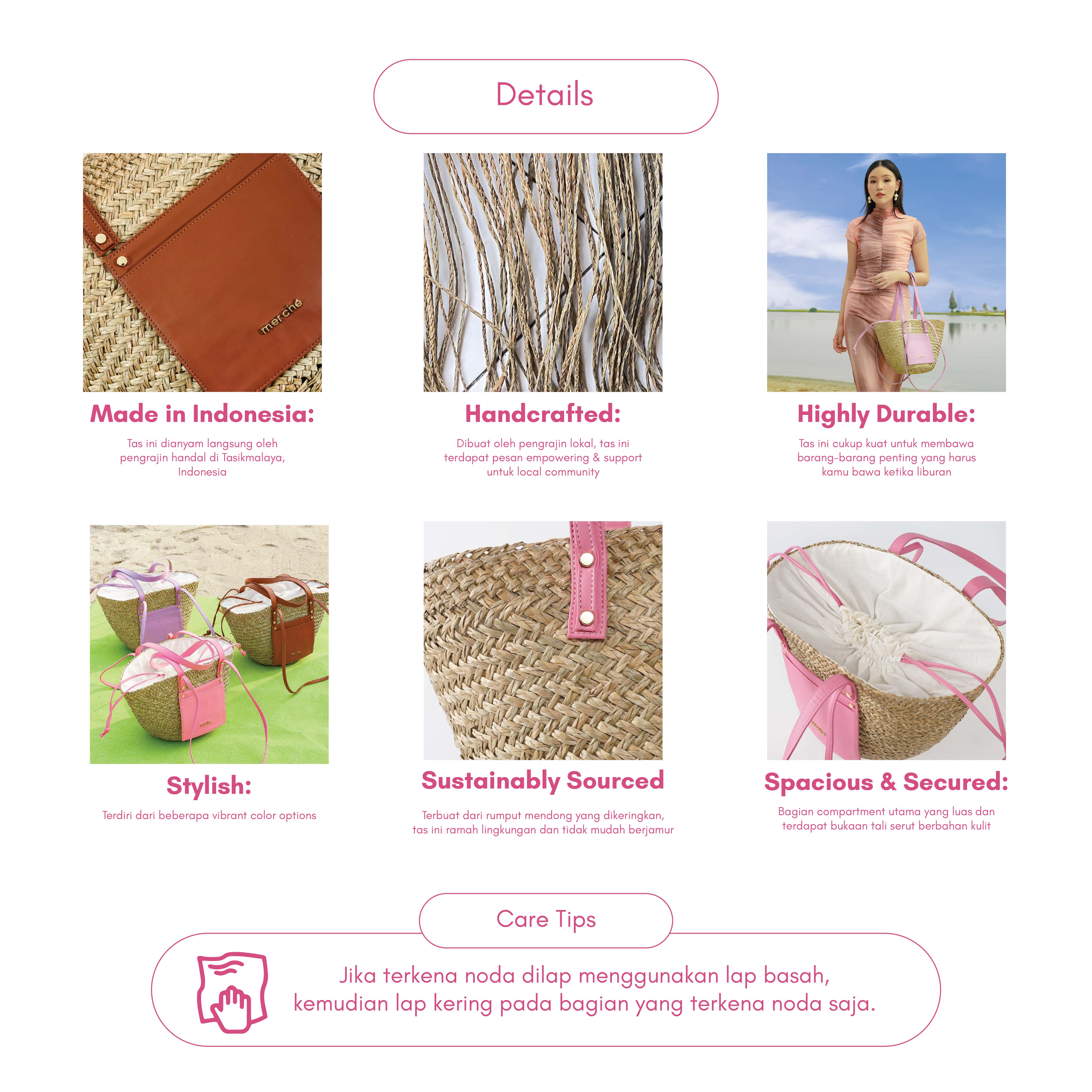 Terbuat dari Cyperaceae Grass, tas ini sangat kuat, mudah dibersihkan dan tidak akan berjamur.
