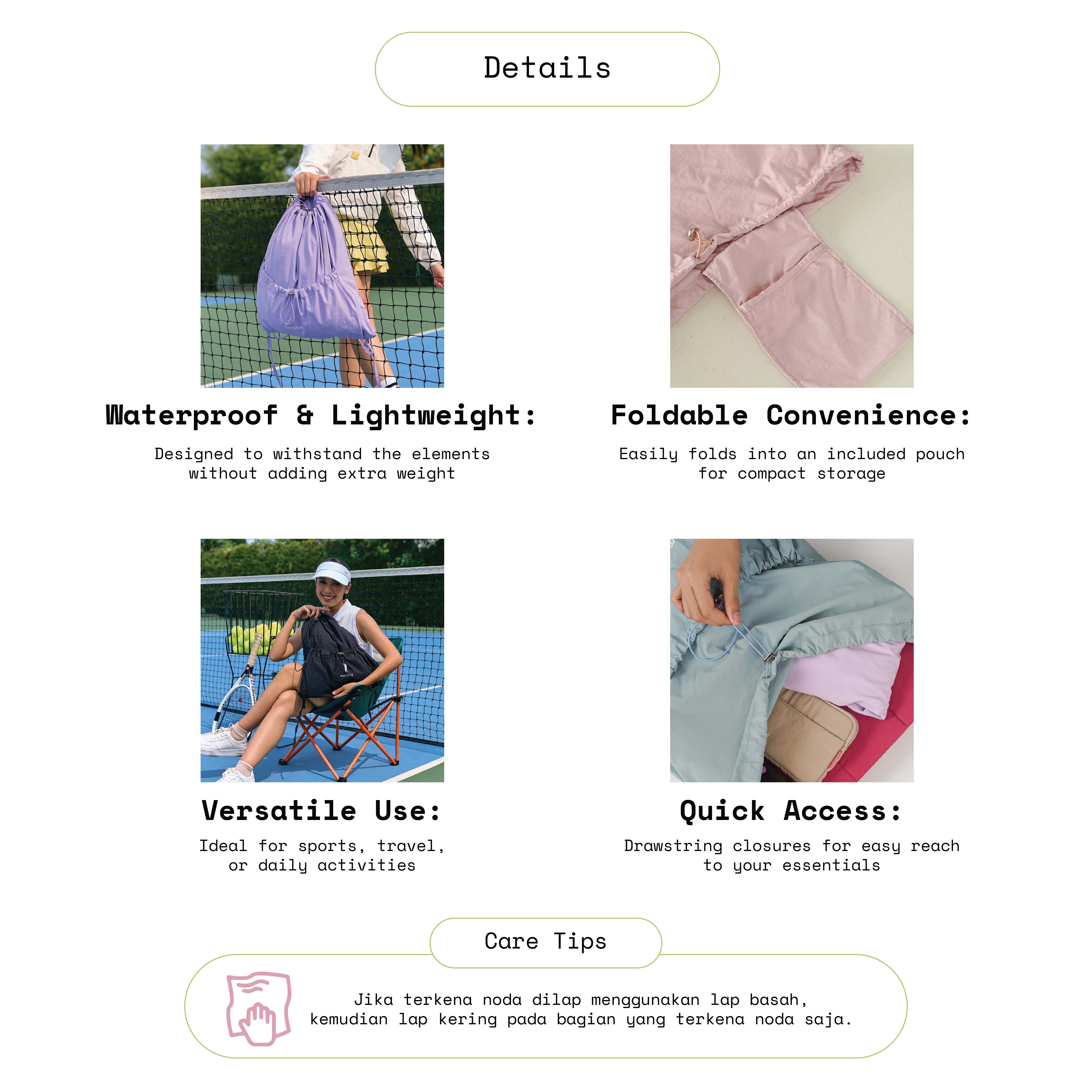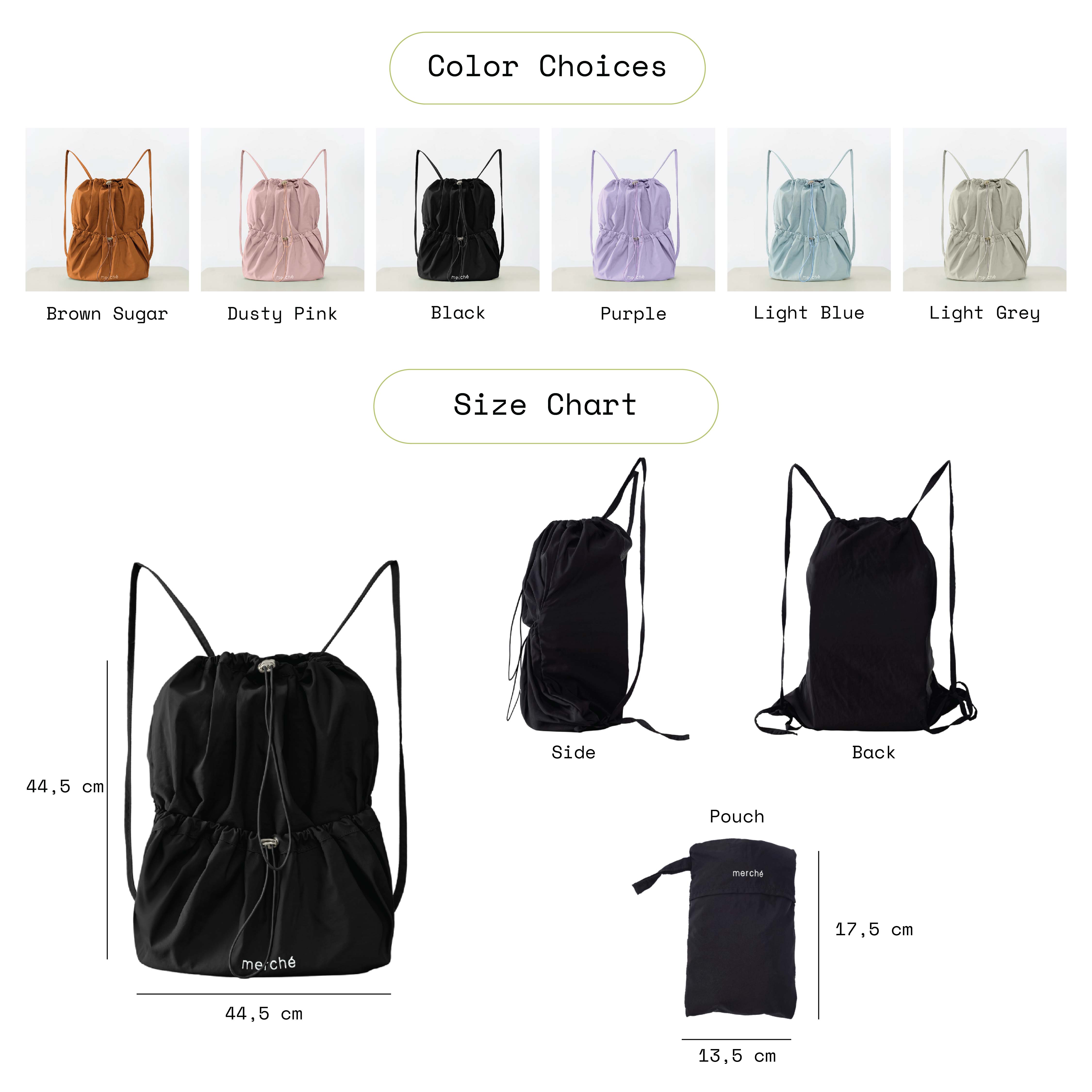 Lightweight, foldable, and equipped with a drawstring closure on the main compartment and front pocket. Comes with a pouch for easy storage and a spacious interior for all your essentials.