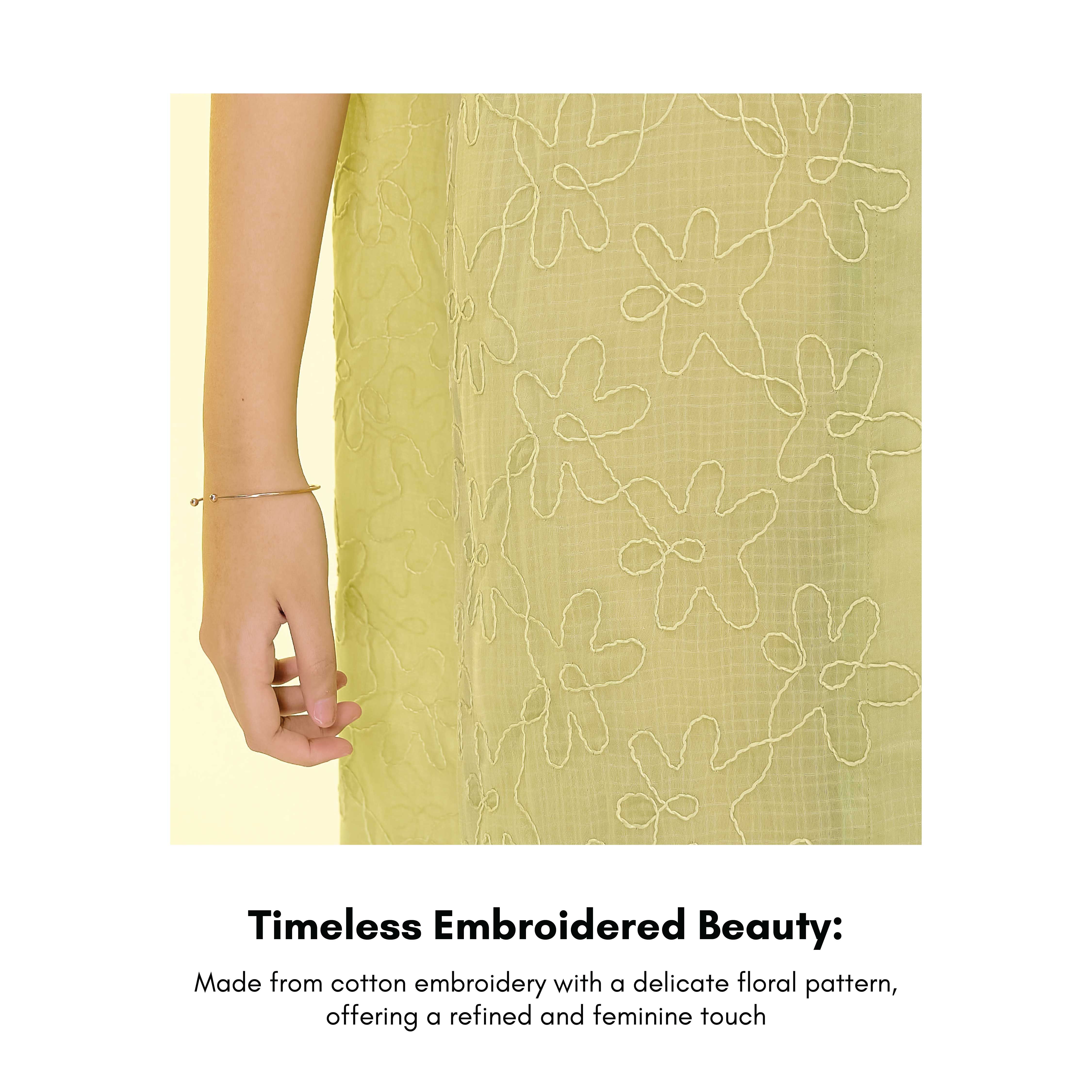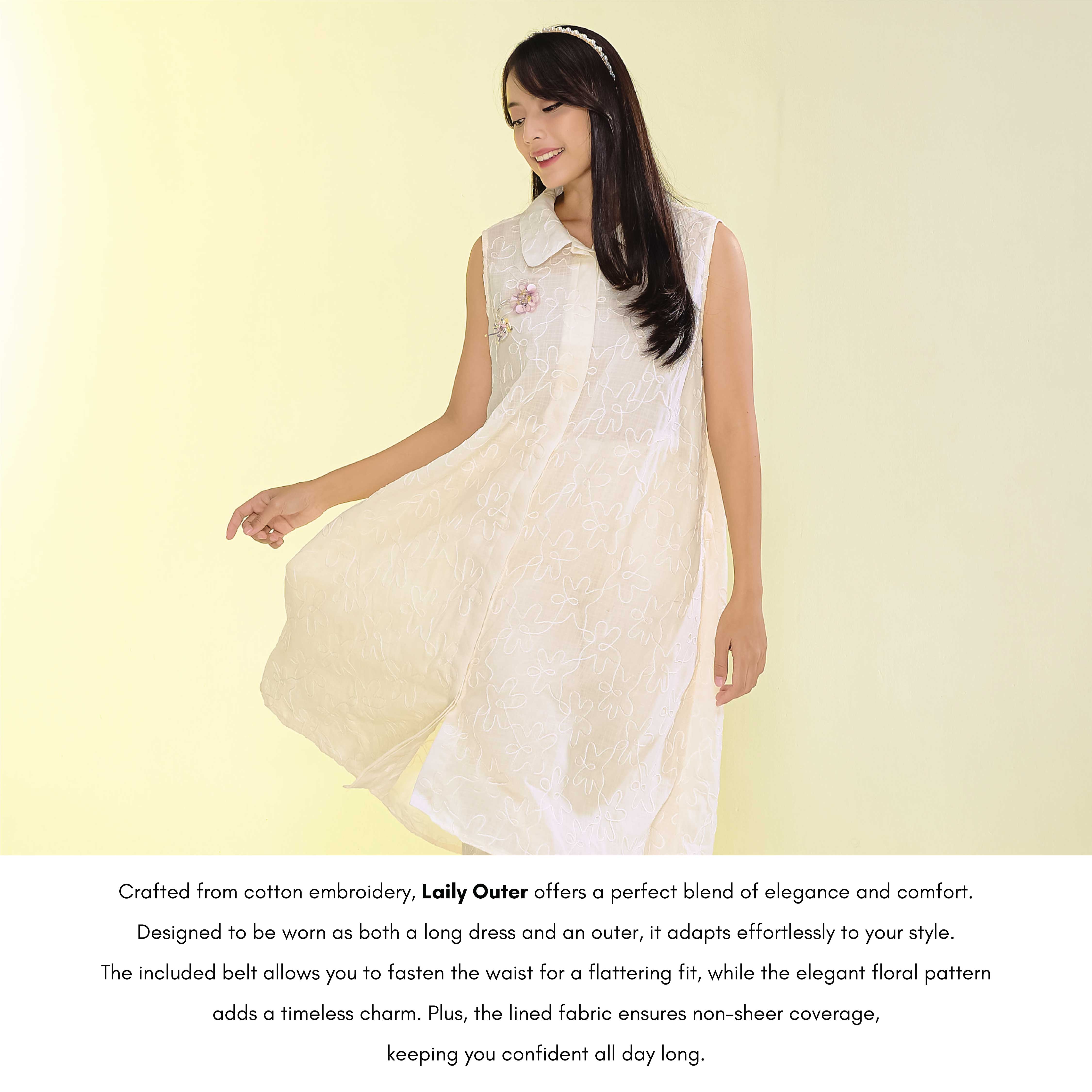 Crafted from Cotton Embroidery, Laily Outer offers a perfect blend of elegance and comfort. Designed to be worn as both a long dress and an outer, it adapts effortlessly to your style. The included belt allows you to fasten the waist for a flattering fit, while the elegant floral pattern adds a timeless charm. Plus, the lined fabric ensures non-sheer coverage, keeping you confident all day long.