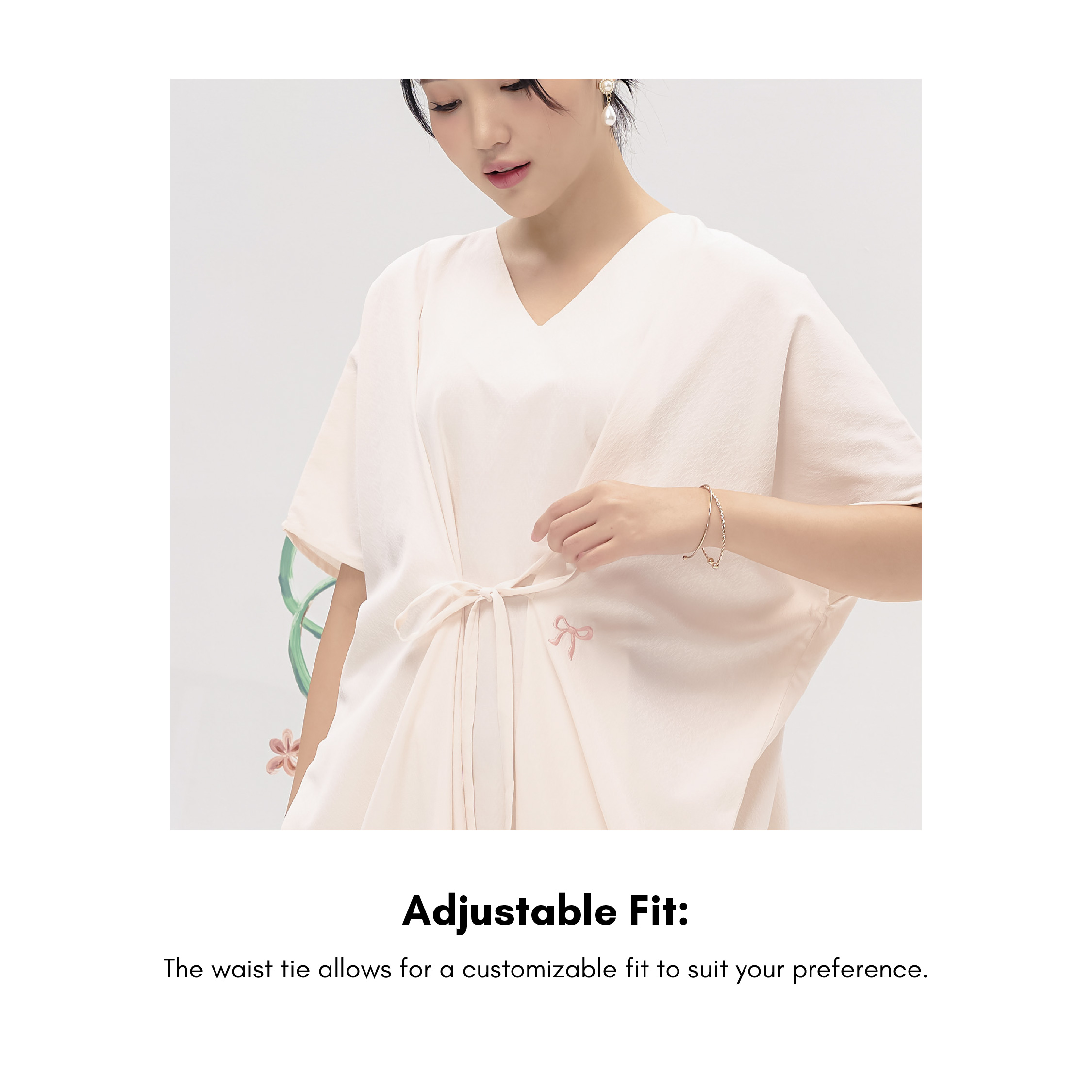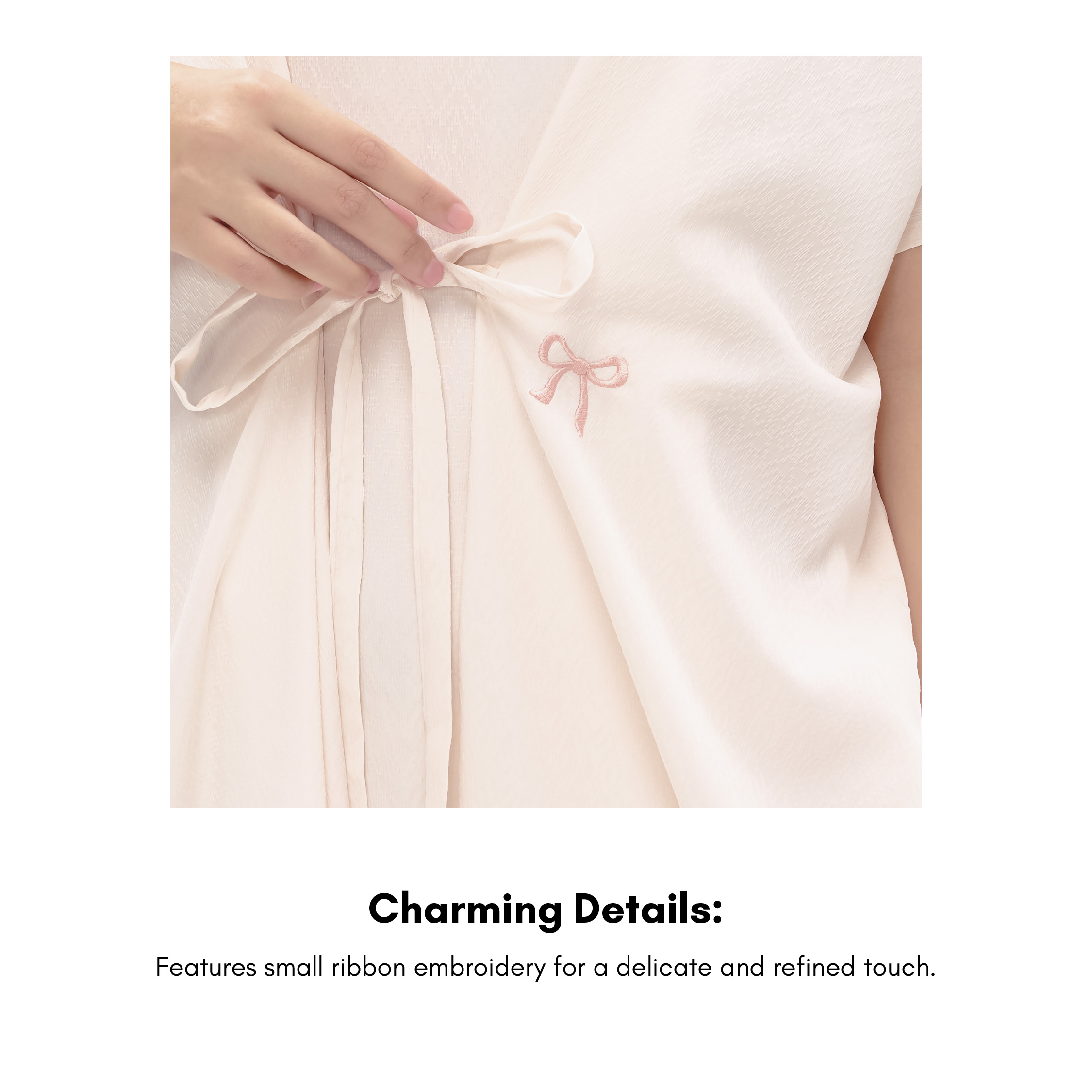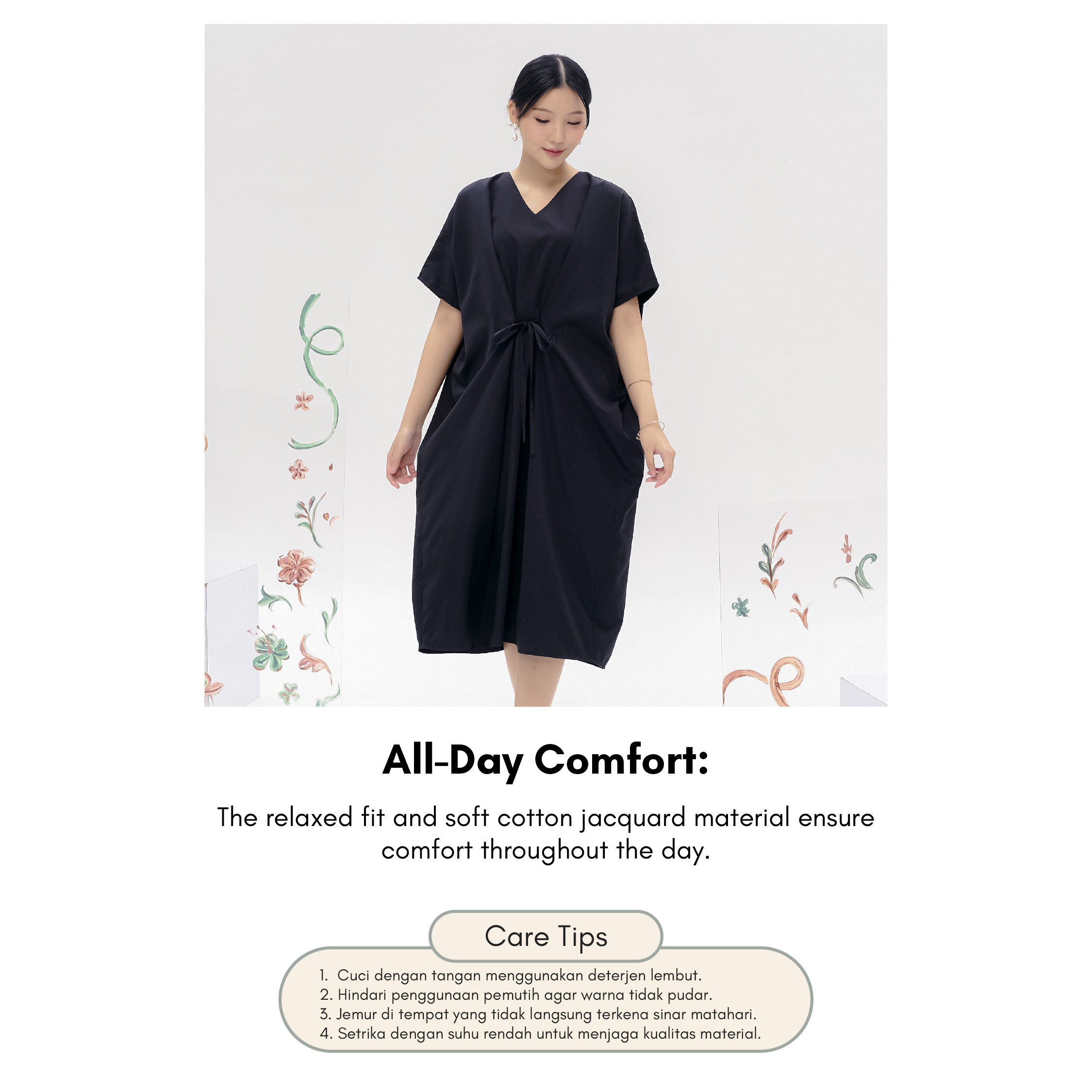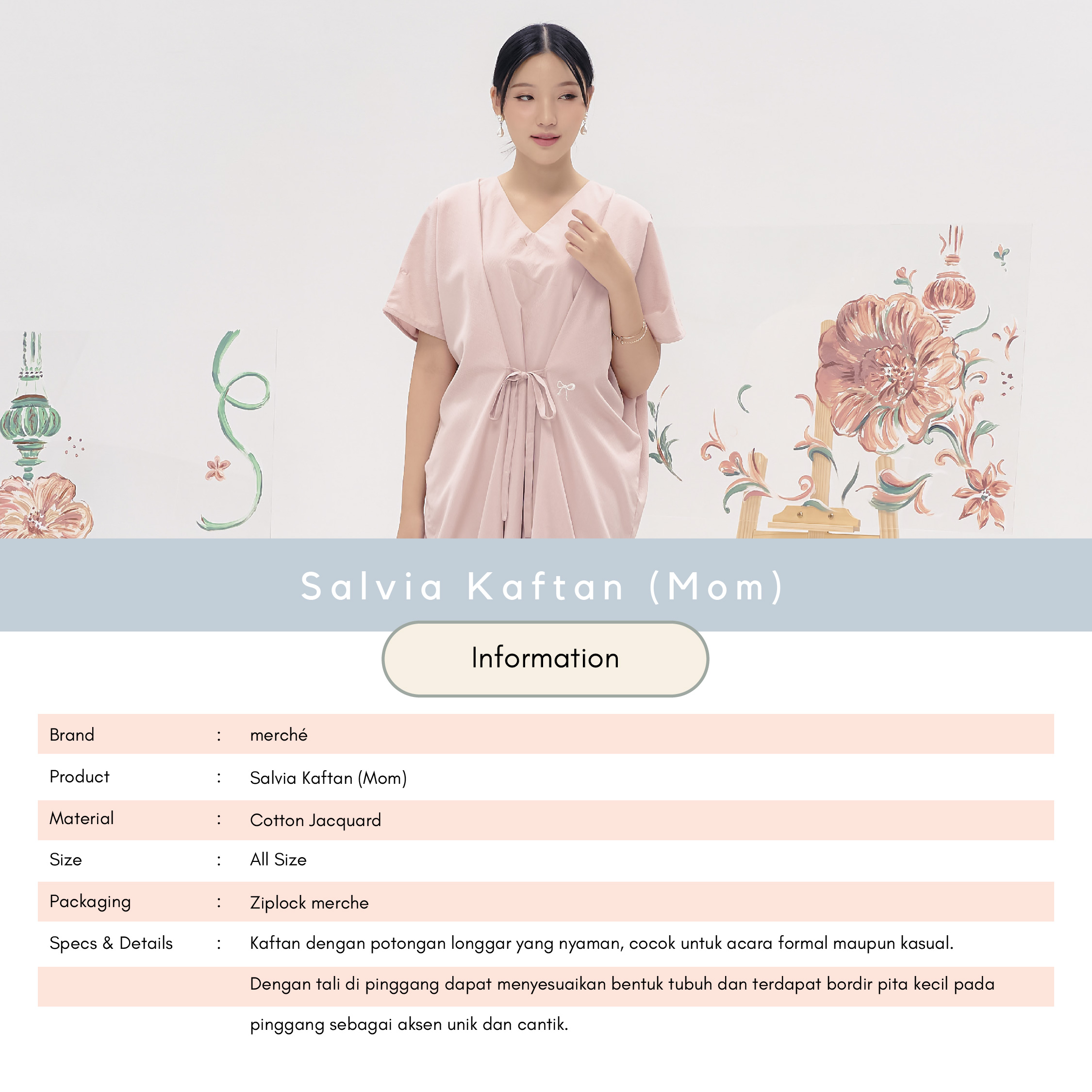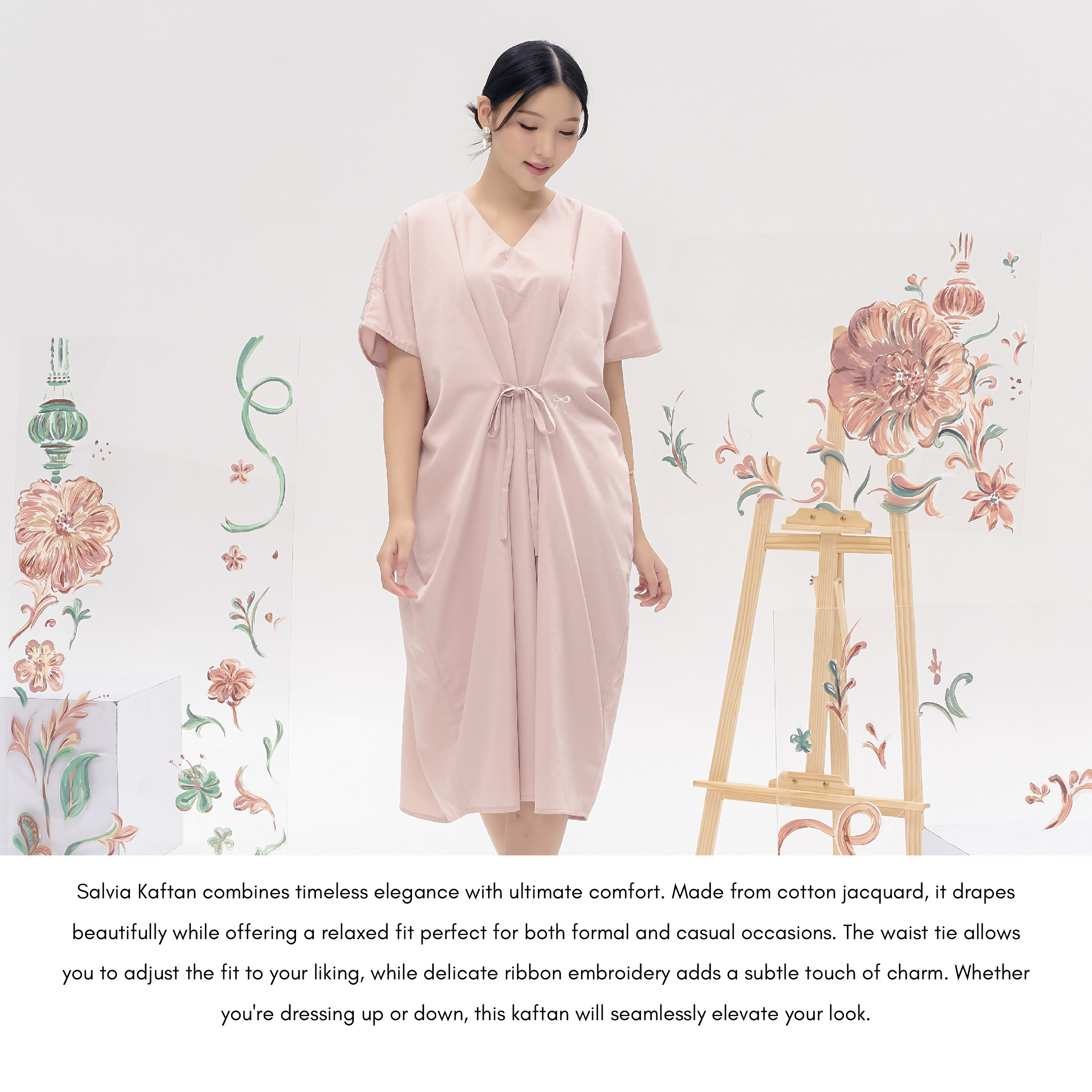 Salvia Kaftan combines timeless elegance with ultimate comfort. Made from cotton jacquard, it drapes beautifully while offering a relaxed fit perfect for both formal and casual occasions. The waist tie allows you to adjust the fit to your liking, while delicate ribbon embroidery adds a subtle touch of charm. Whether you're dressing up or down, this kaftan will seamlessly elevate your look.