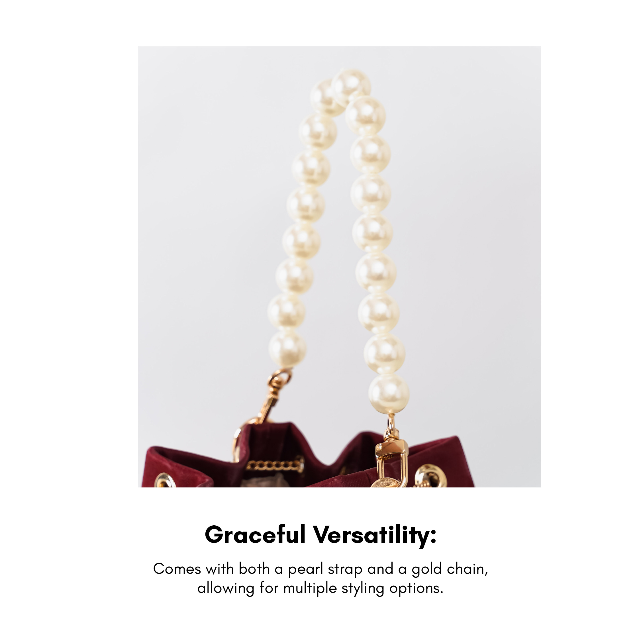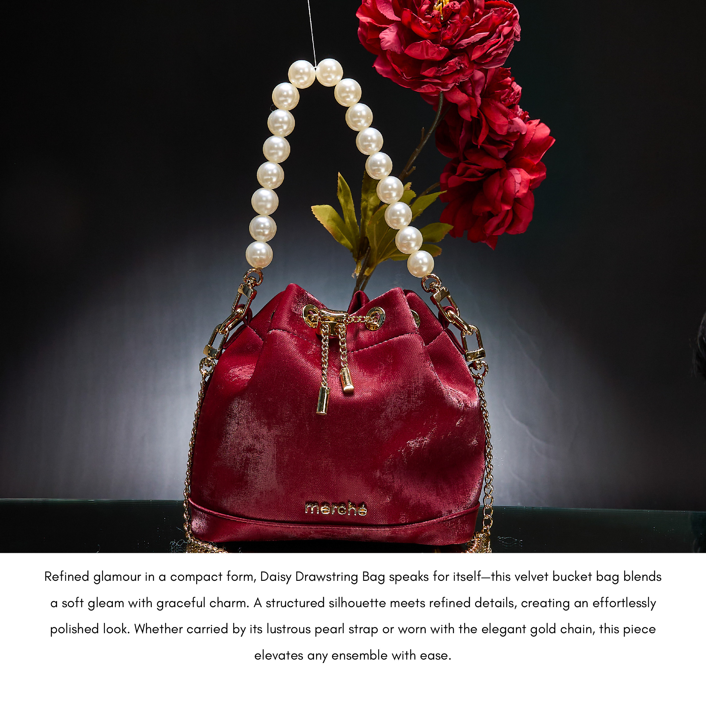 Refined glamour in a compact form, Daisy Drawstring Bag speaks for itself—this velvet bucket bag blends a soft gleam with graceful charm. A structured silhouette meets refined details, creating an effortlessly polished look. Whether carried by its lustrous pearl strap or worn with the elegant gold chain, this piece elevates any ensemble with ease.
