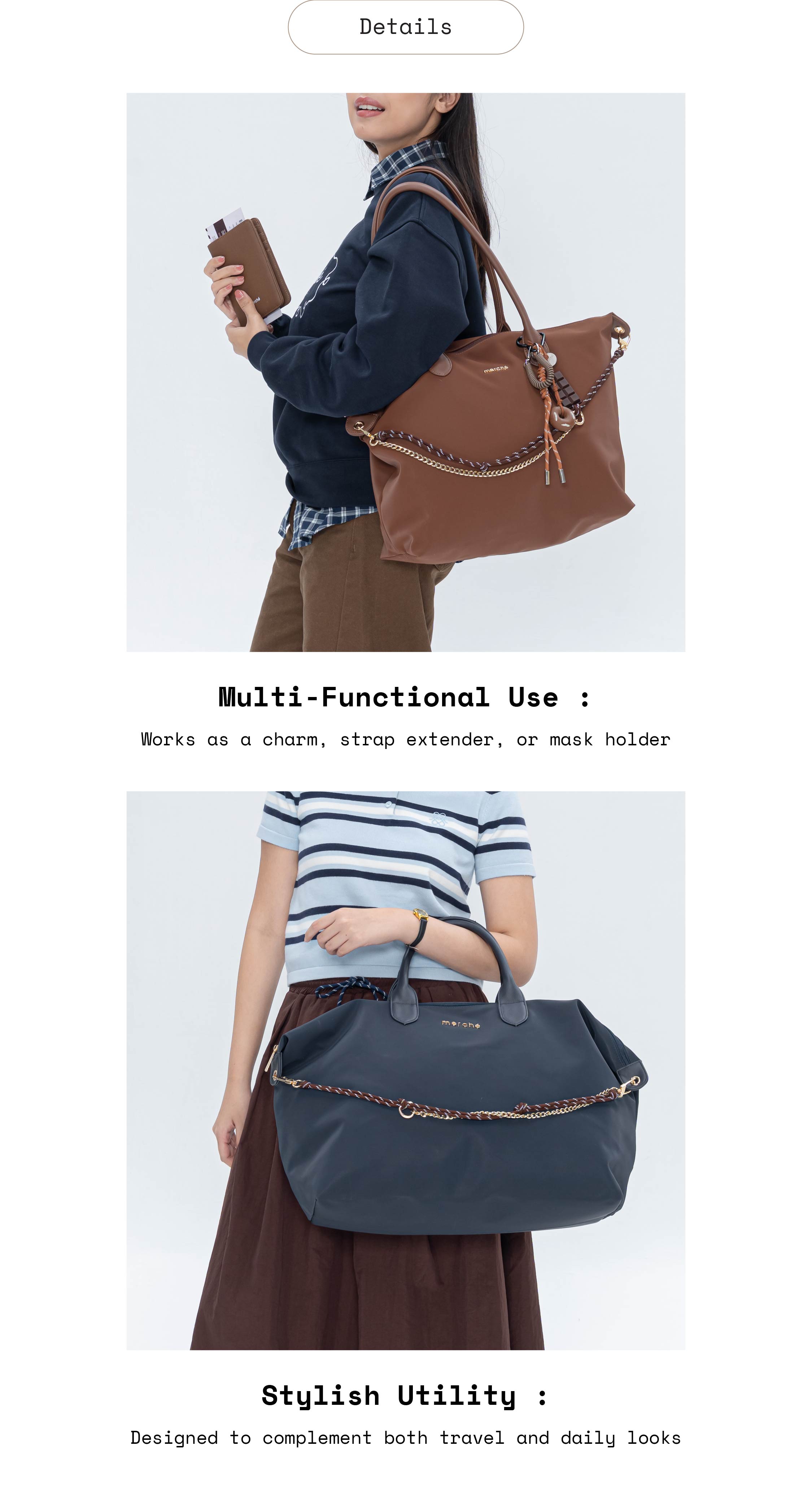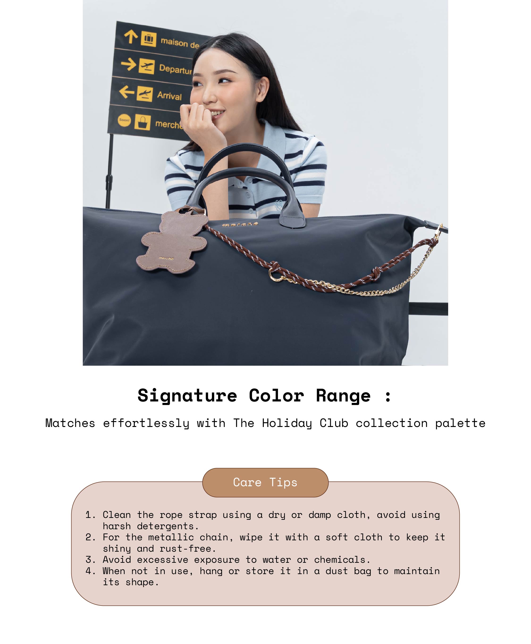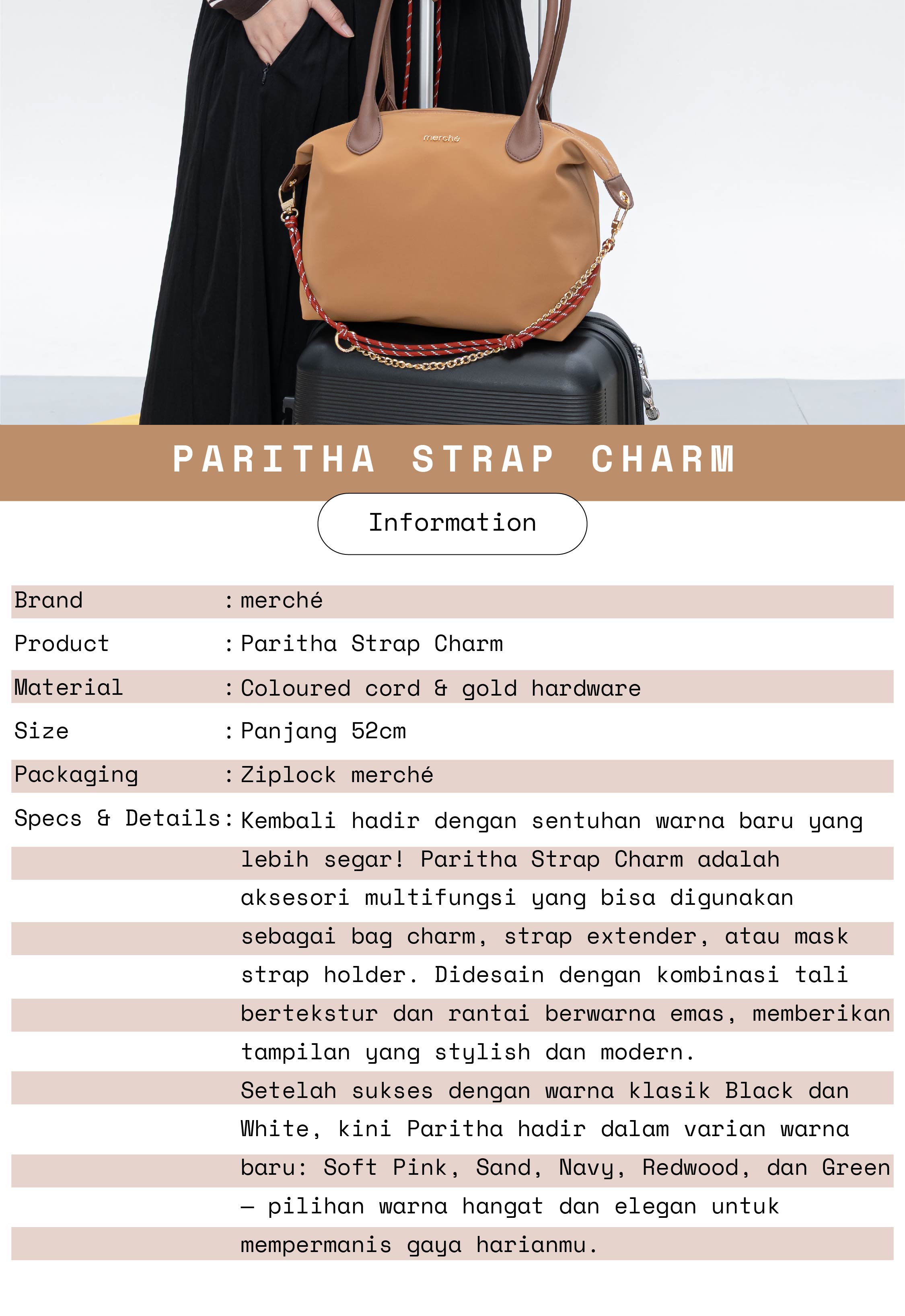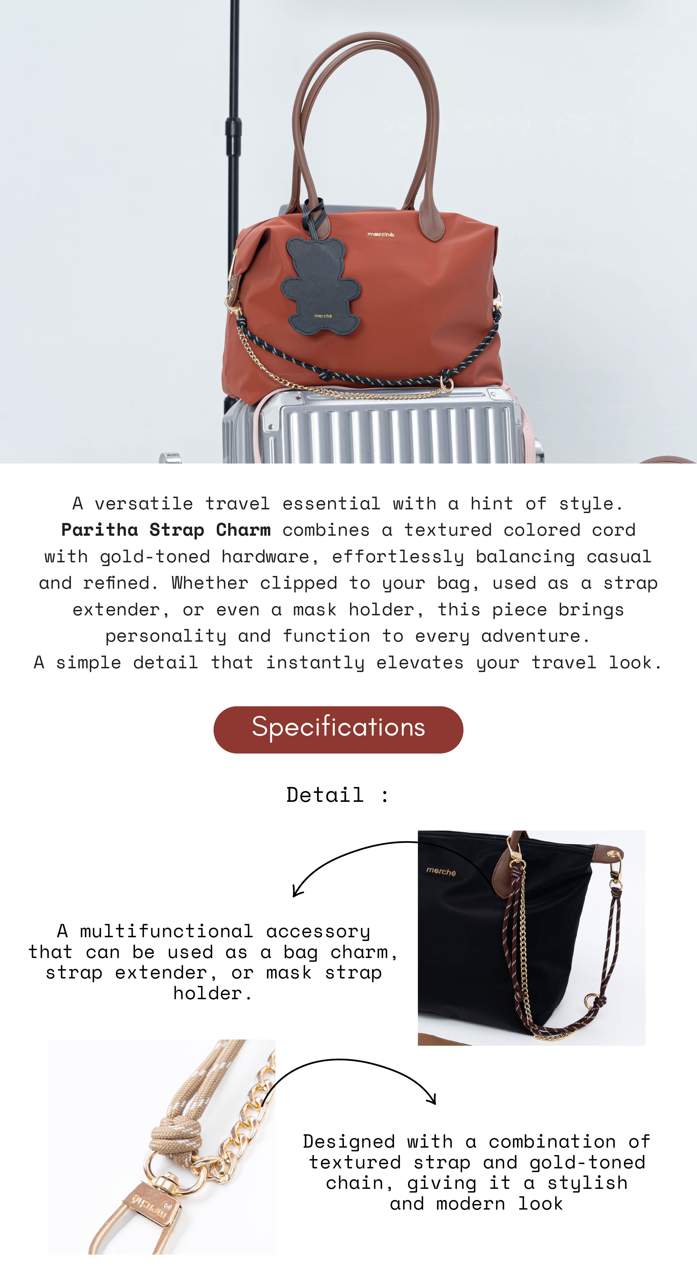 A versatile travel essential with a hint of style. Paritha Strap Charm combines a textured colored cord with gold-toned hardware, effortlessly balancing casual and refined. Whether clipped to your bag, used as a strap extender, or even a mask holder, this piece brings personality and function to every adventure. A simple detail that instantly elevates your travel look.