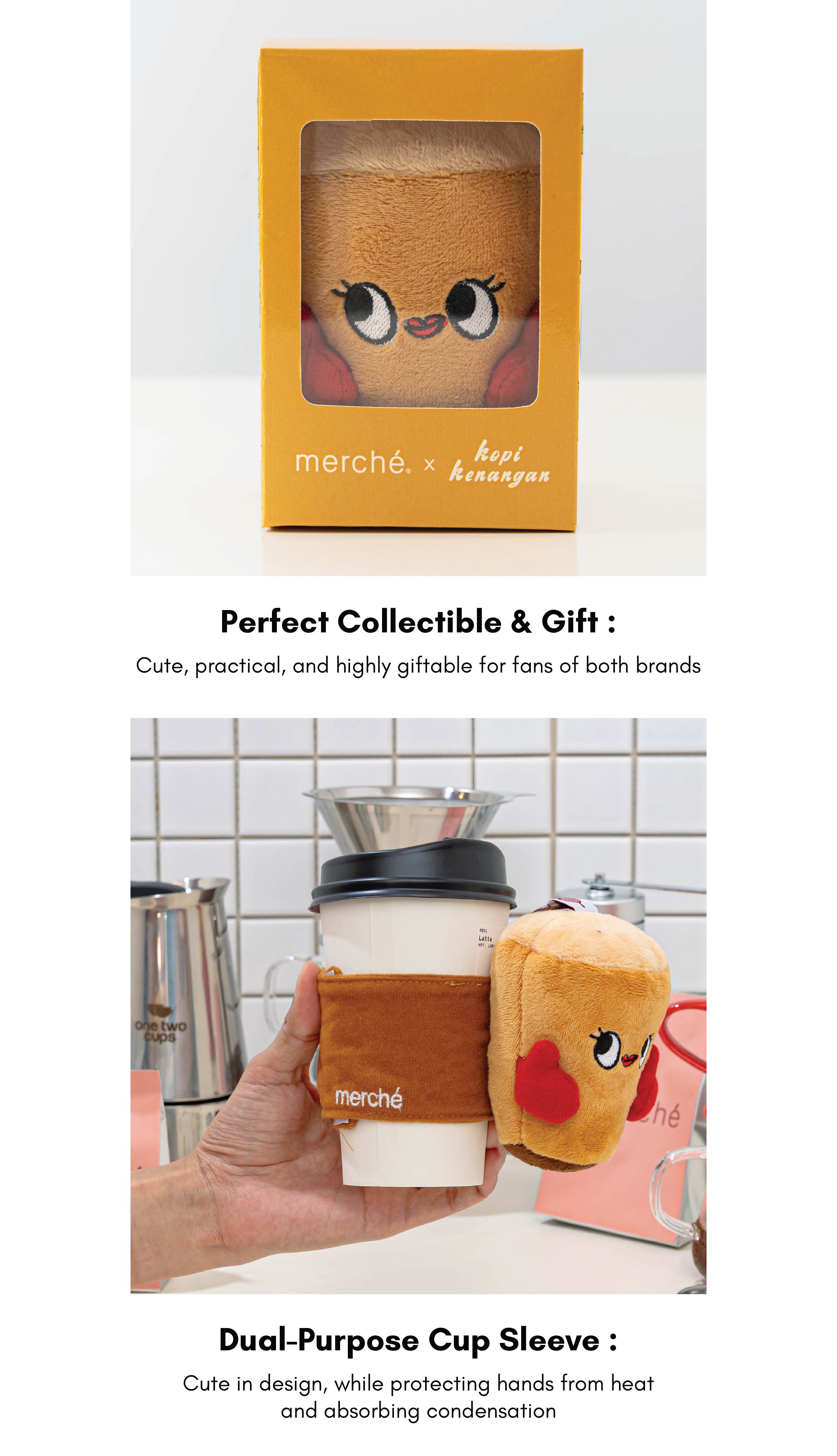 A playful blend of style and function, Macy Kenangan Mantan is designed in the shape of Kopi Kenangan’s iconic coffee cup, brought to life with the sweet expressions of Macy, merché’s beloved mascot. More than just a collectible, it’s detailed with a woven label and O-ring carabiner for easy attachment, while hiding a practical surprise: a foldable cup sleeve tucked inside.