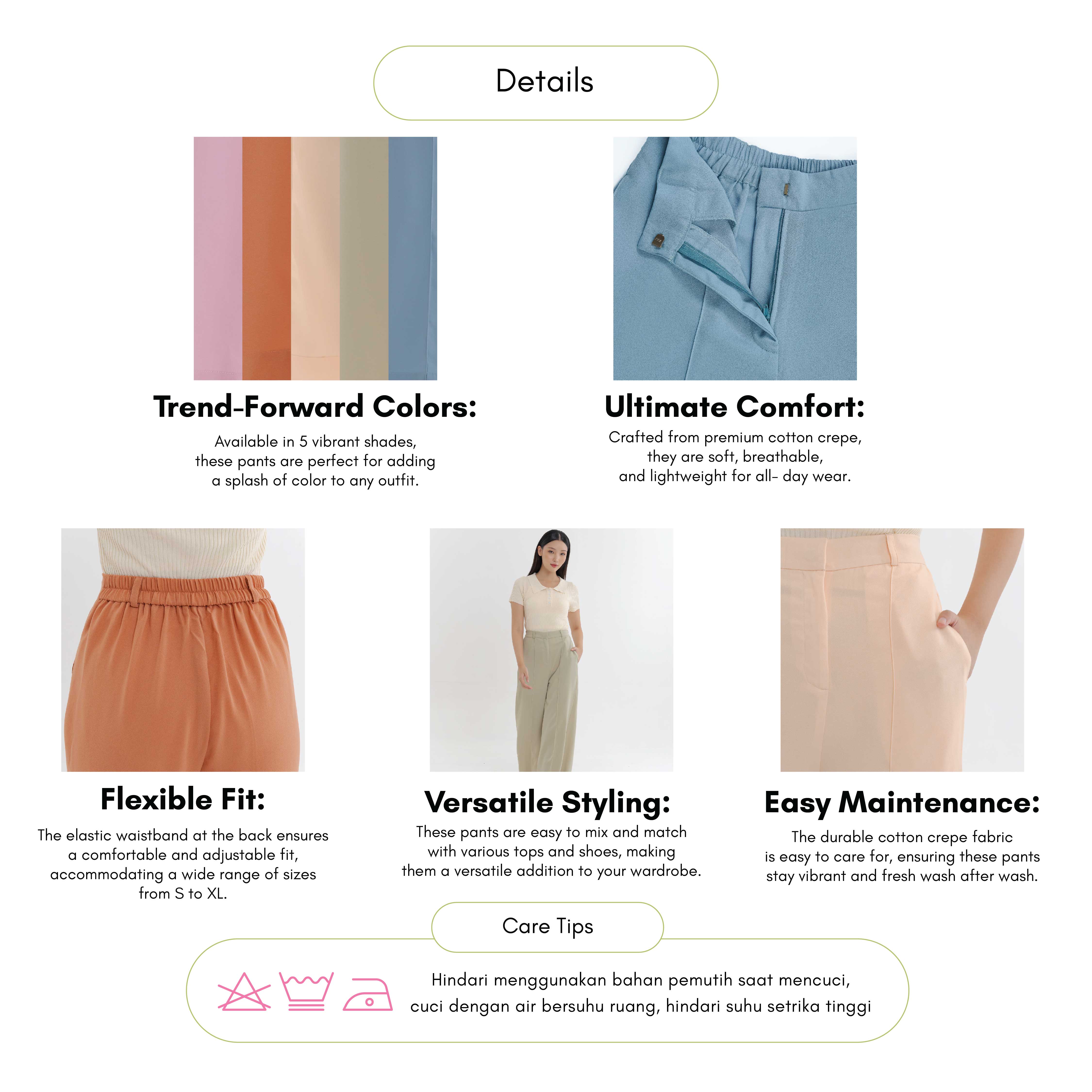 Made from cotton crepe, they offer a soft and breathable fit. The elastic waistband at the back provides added comfort and flexibility, making these pants suitable for everyone, from size S to XL.