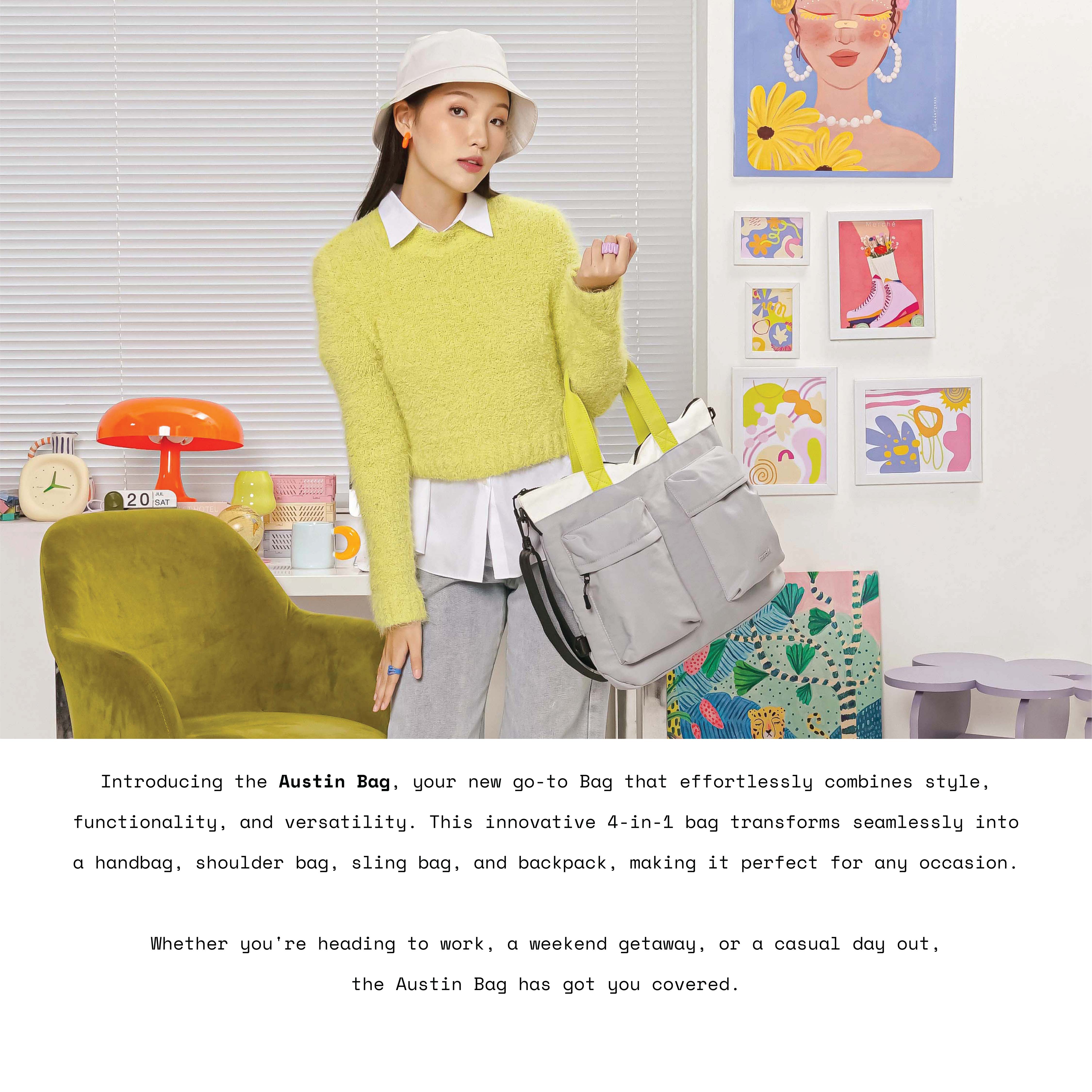Whether you're heading to work, a weekend getaway, or a casual day out, the Austin Bag has got you covered.