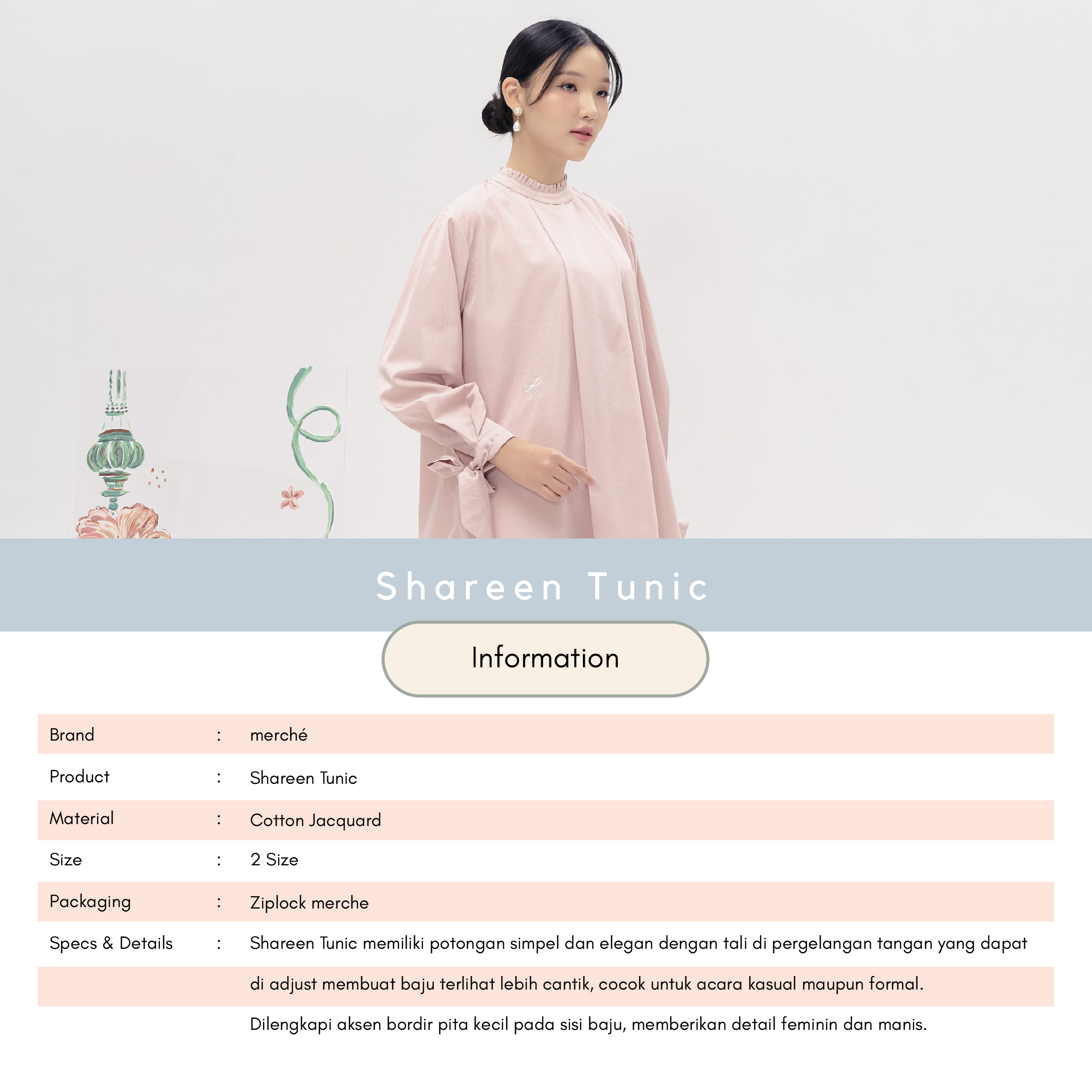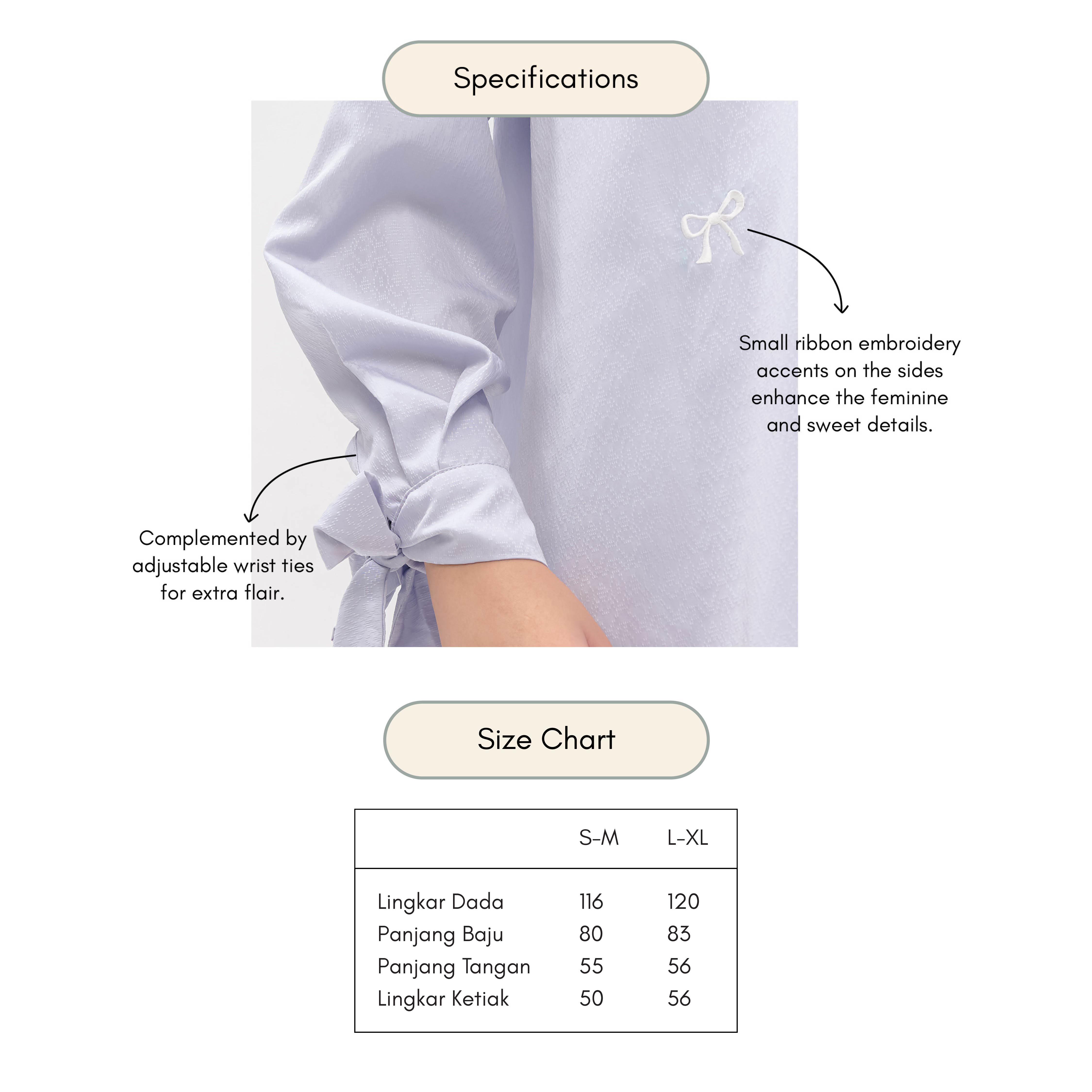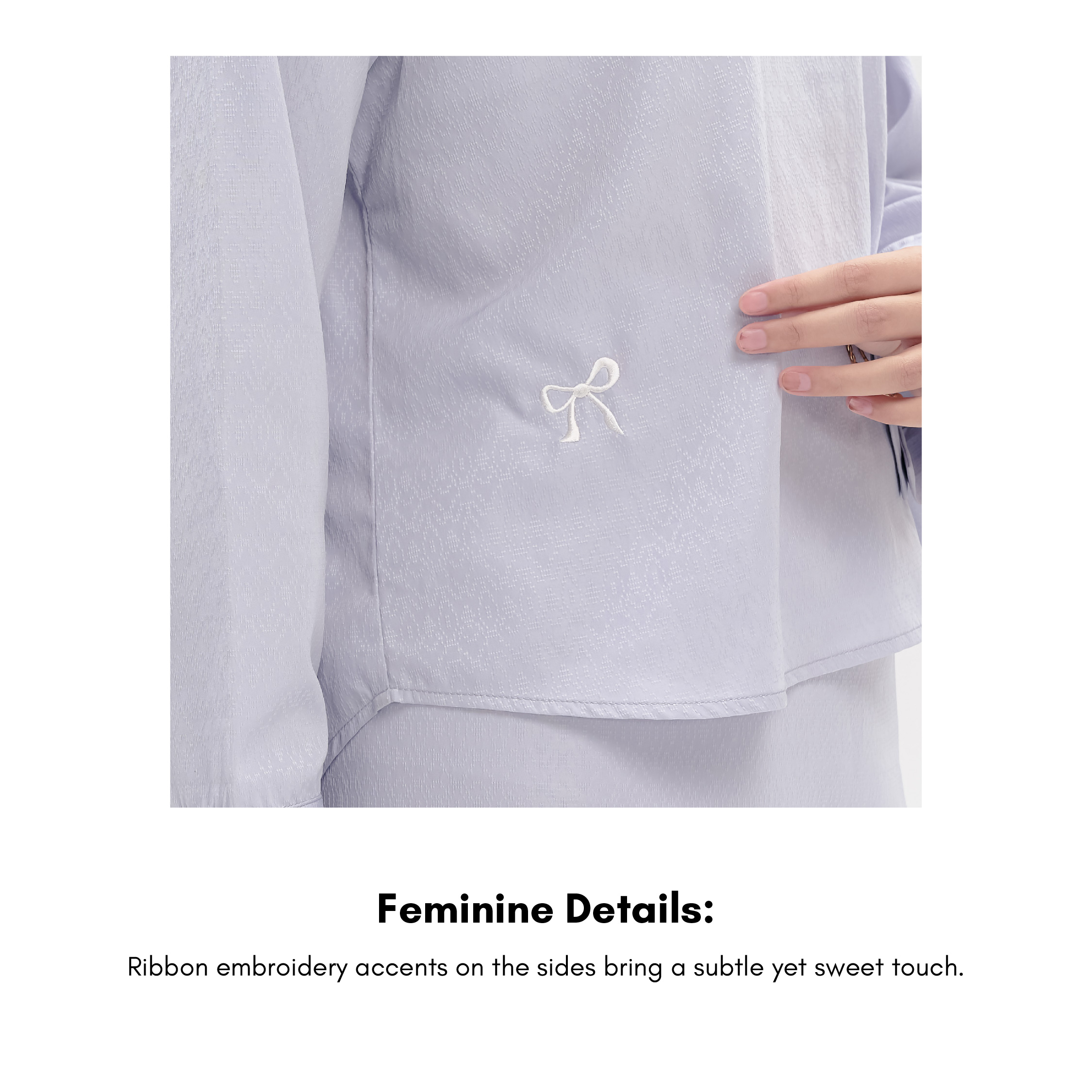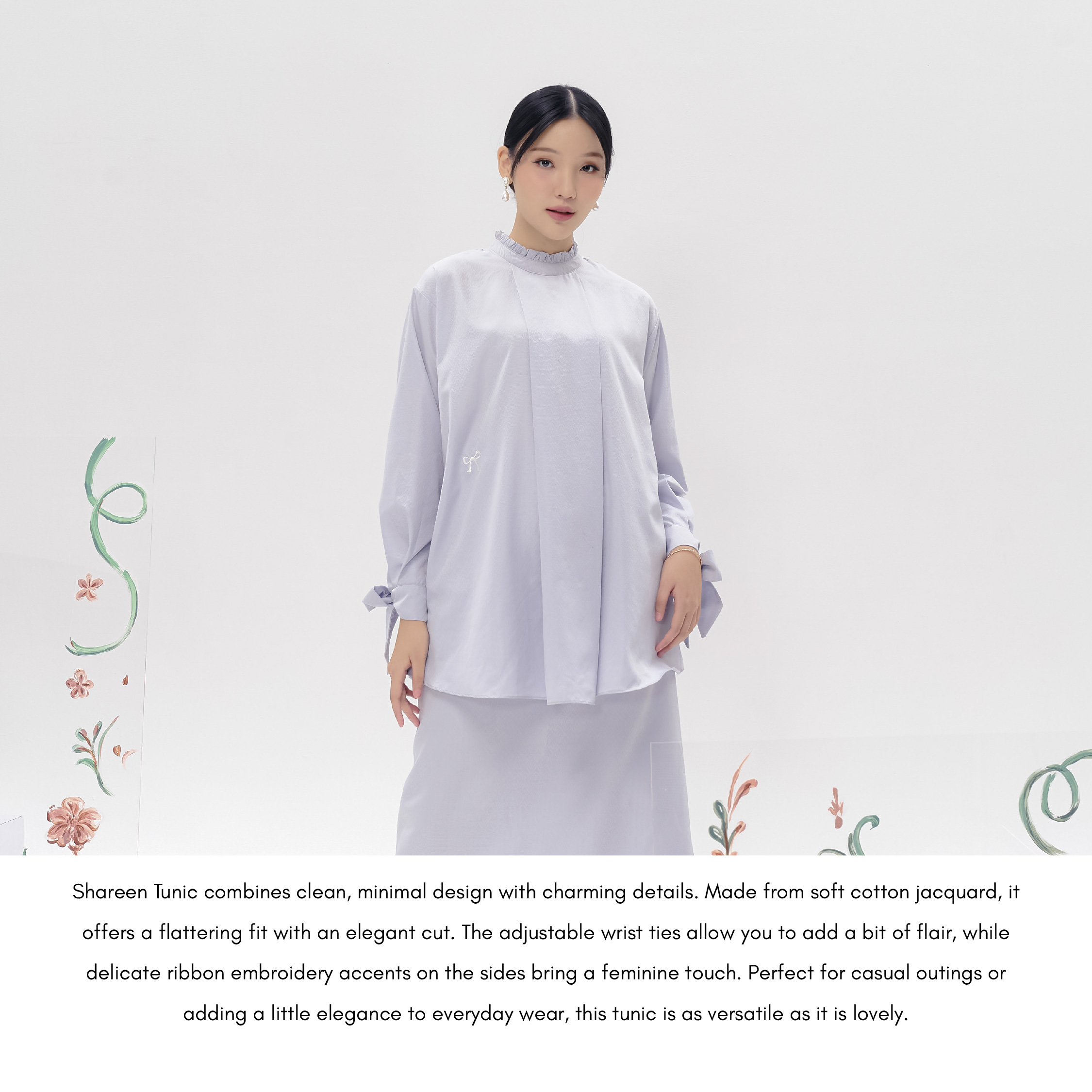 Shareen Tunic combines clean, minimal design with charming details. Made from soft cotton jacquard, it offers a flattering fit with an elegant cut. The adjustable wrist ties allow you to add a bit of flair, while delicate ribbon embroidery accents on the sides bring a feminine touch. Perfect for casual outings or adding a little elegance to everyday wear, this tunic is as versatile as it is lovely.