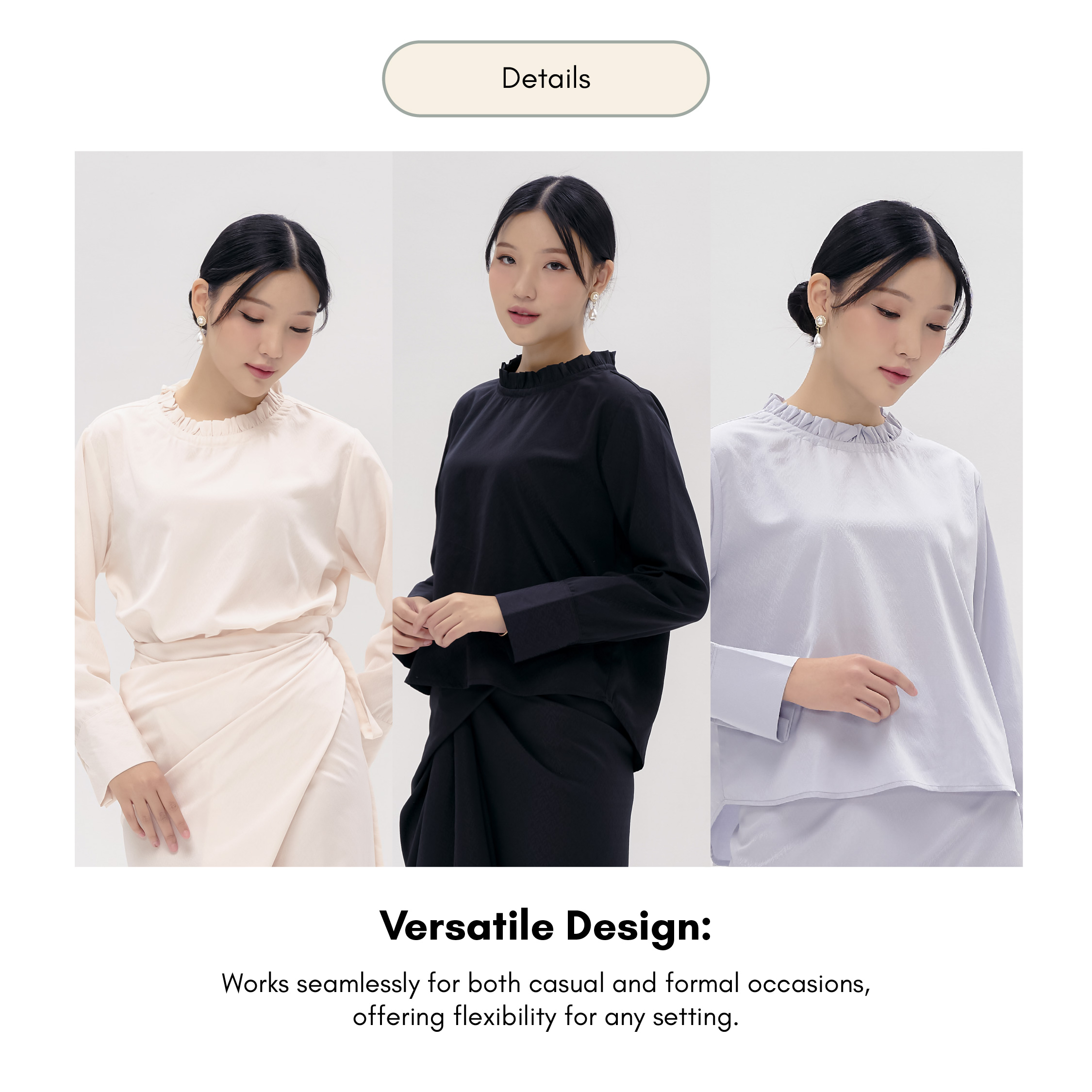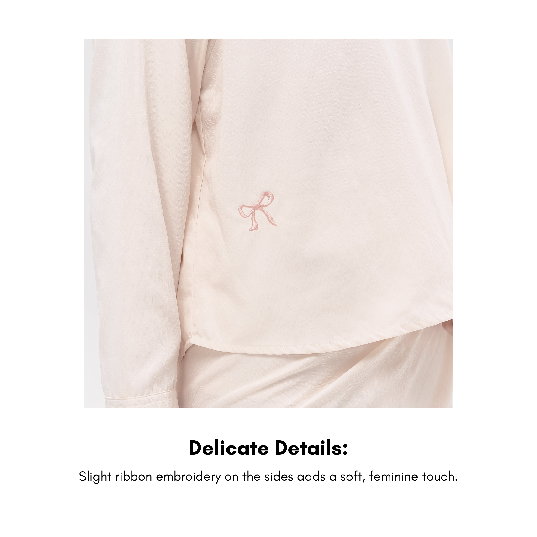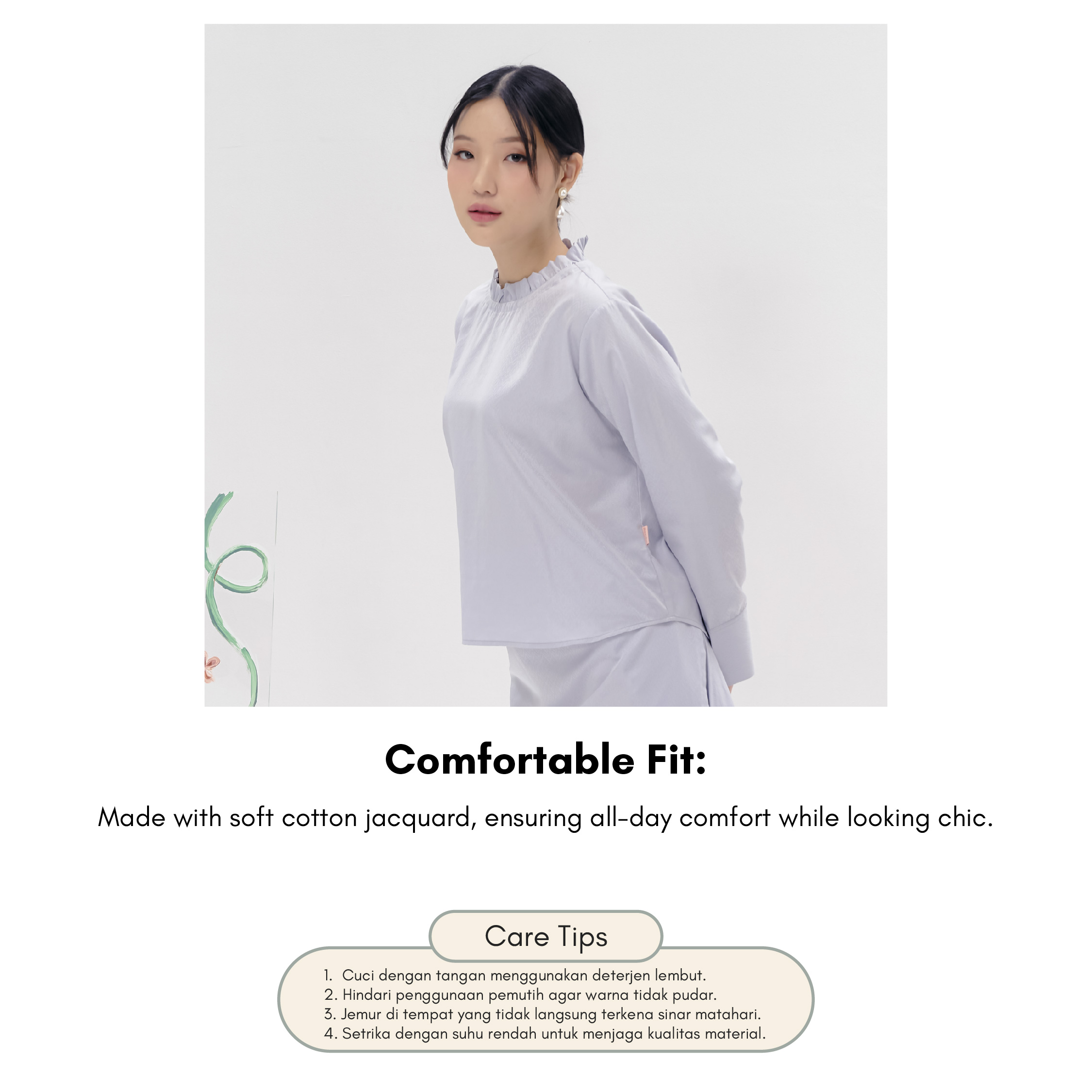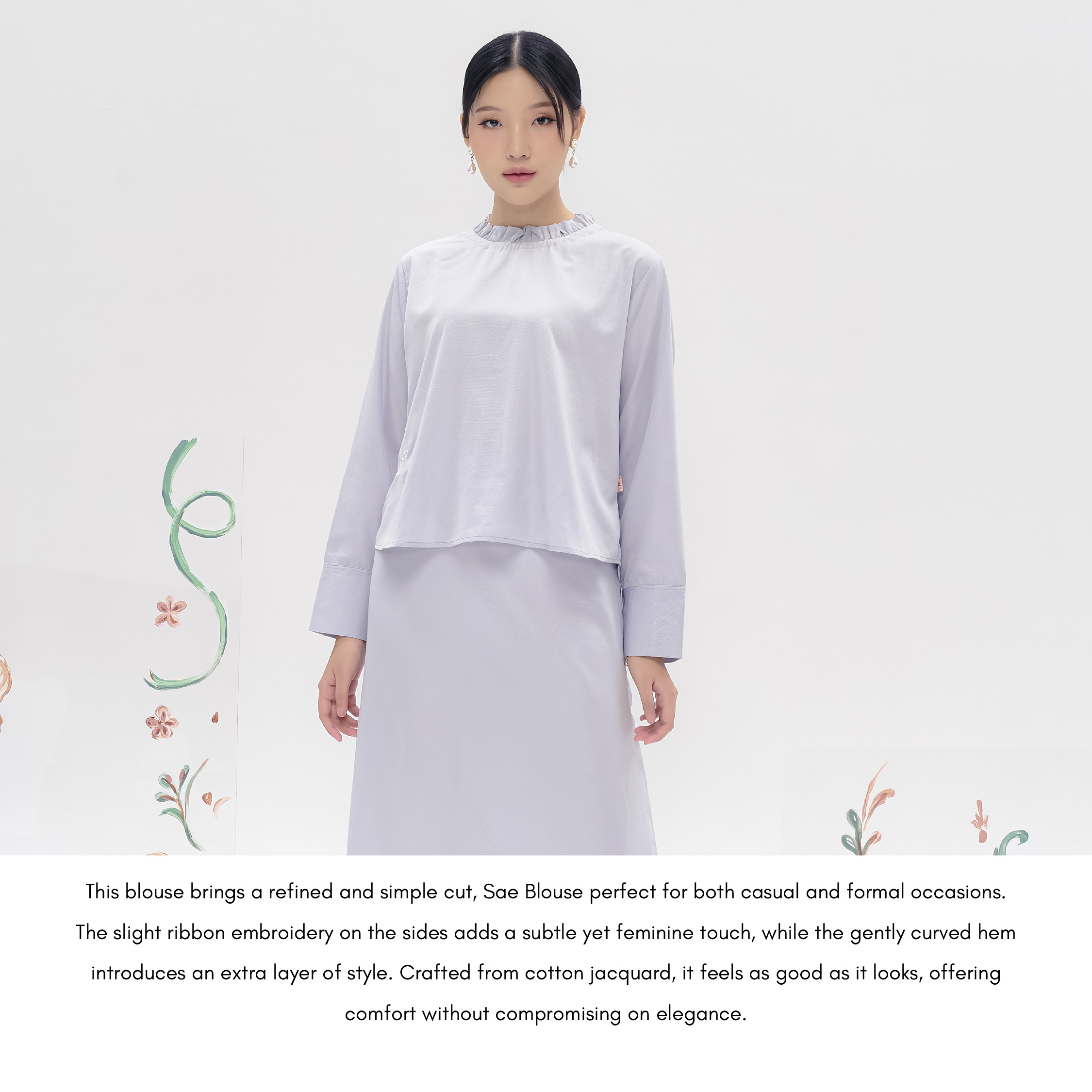 This blouse brings a refined and simple cut, Sae Blouse perfect for both casual and formal occasions. The slight ribbon embroidery on the sides adds a subtle yet feminine touch, while the gently curved hem introduces an extra layer of style. Crafted from cotton jacquard, it feels as good as it looks, offering comfort without compromising on elegance.