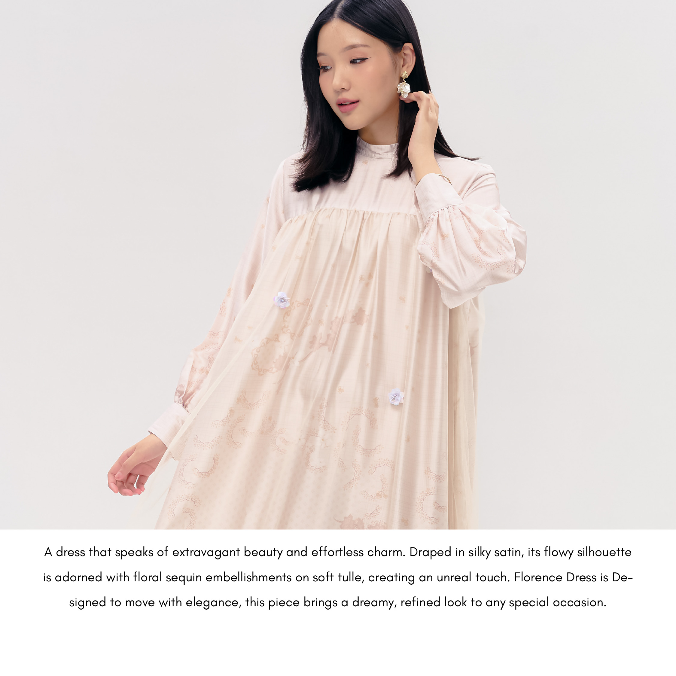 A dress that speaks of extravagant beauty and effortless charm. Draped in silky satin, its flowy silhouette is adorned with floral sequin embellishments on soft tulle, creating an unreal touch. Florence Dress is Designed to move with elegance, this piece brings a dreamy, refined look to any special occasion.