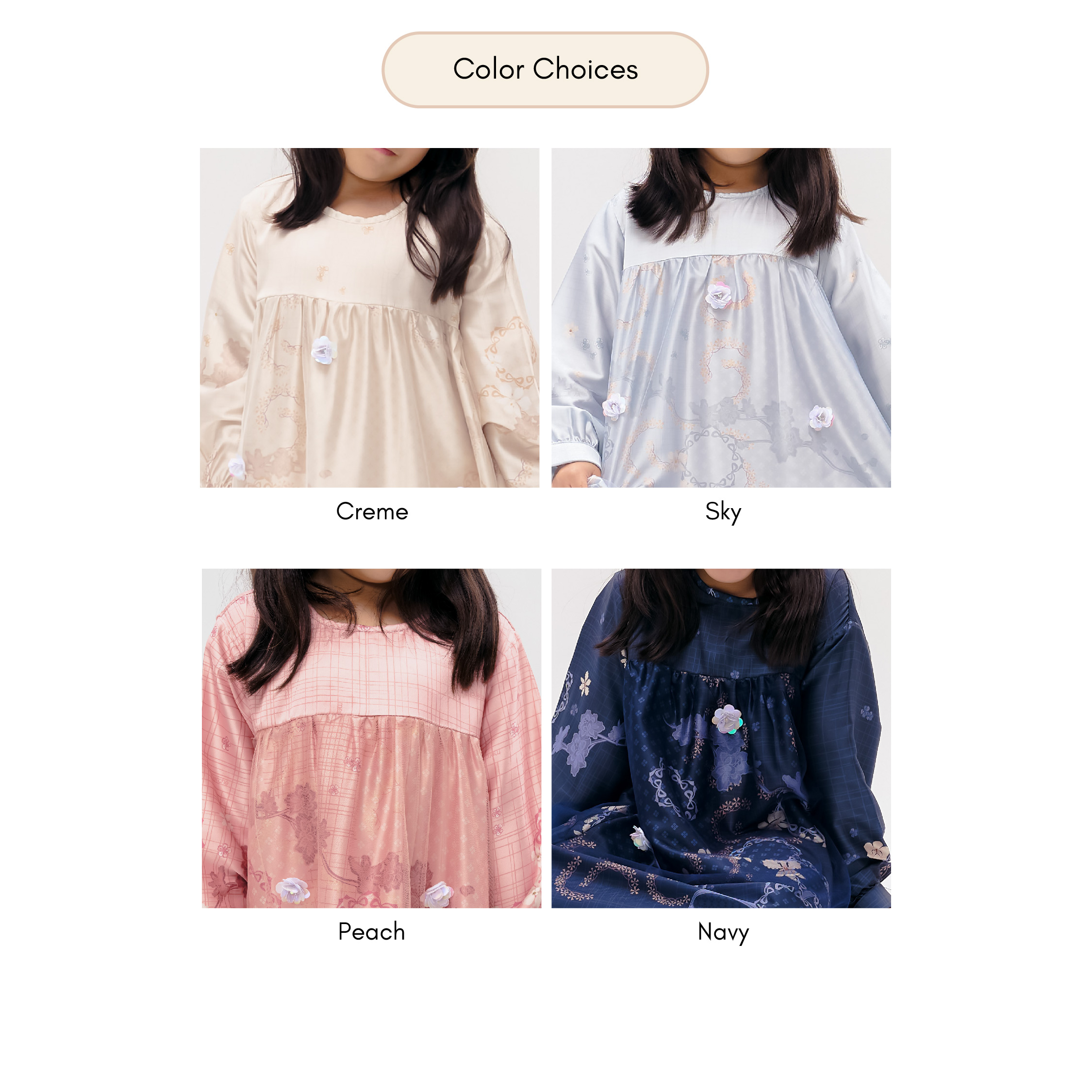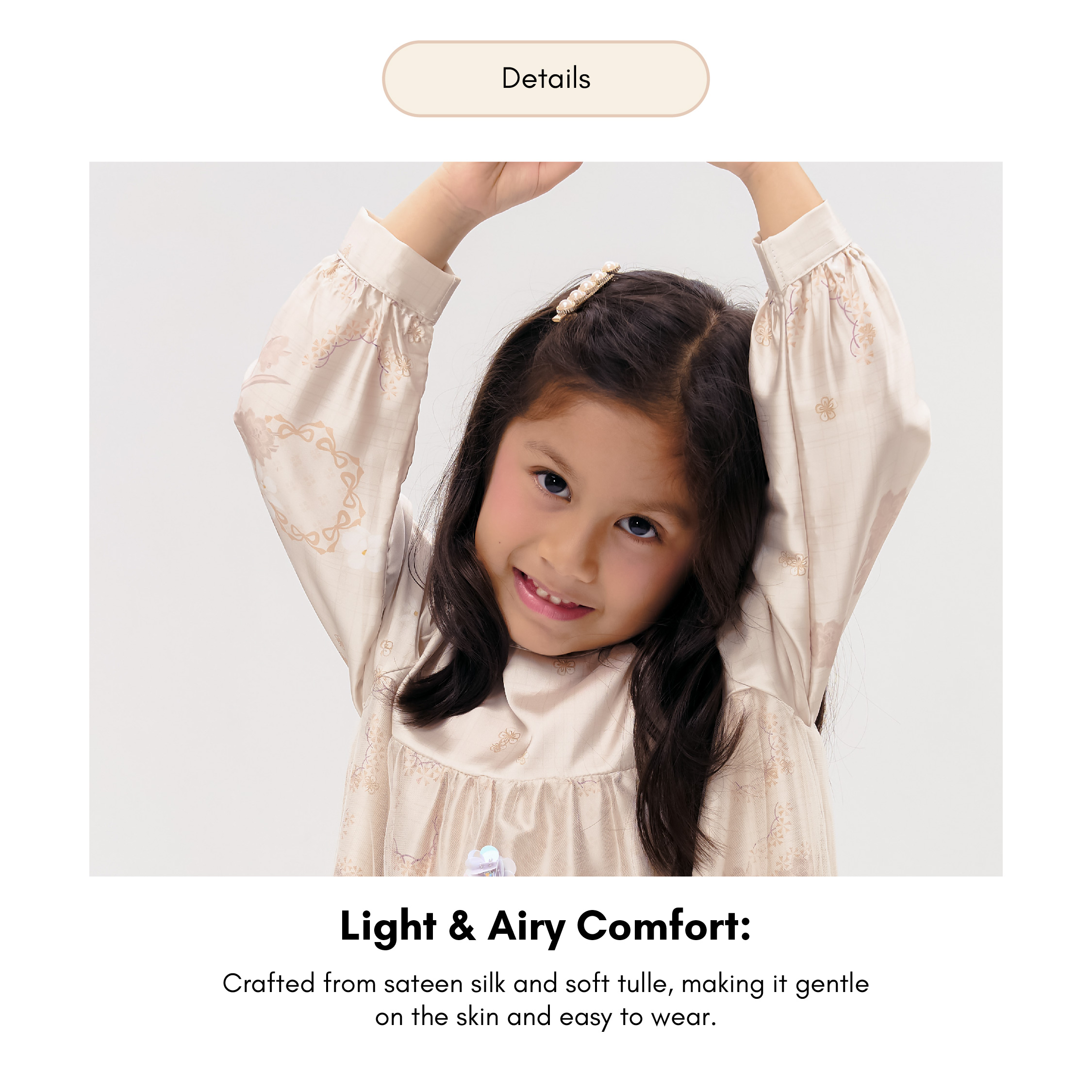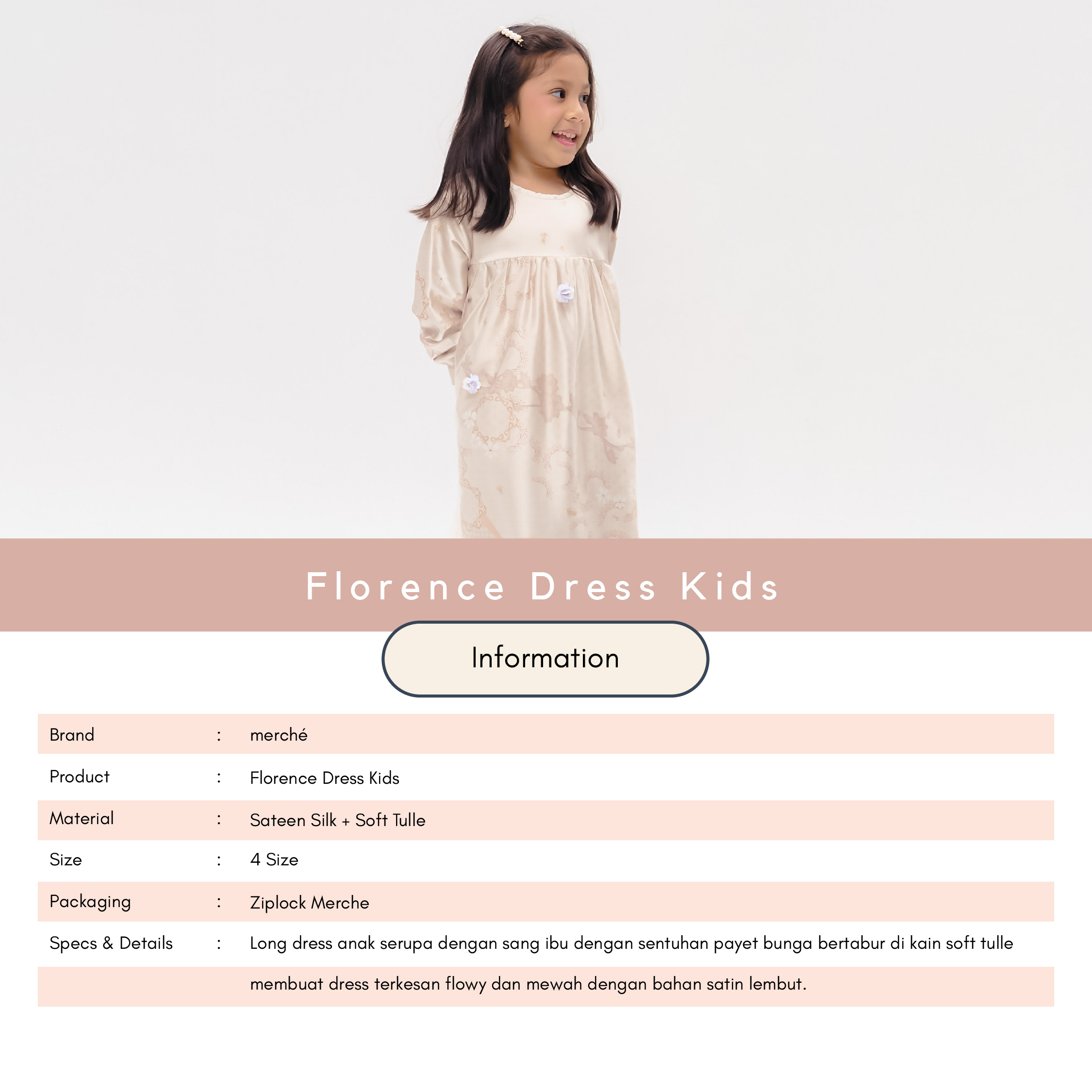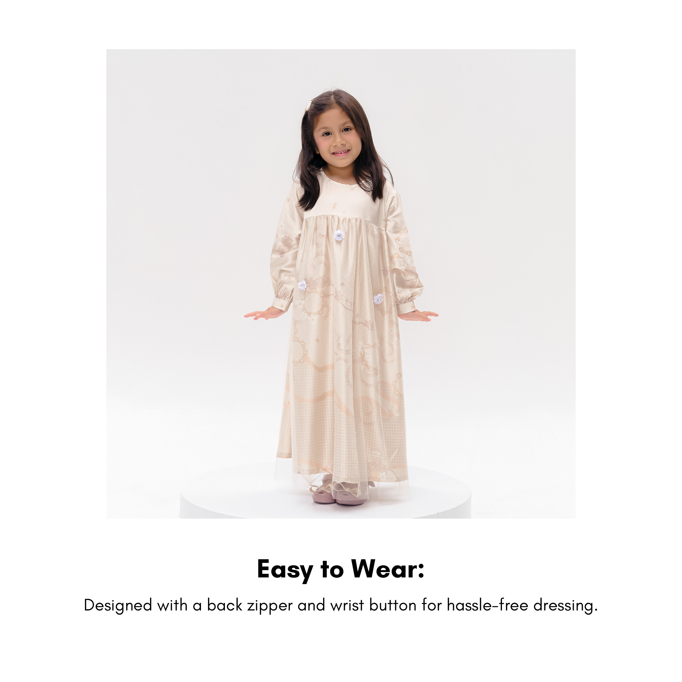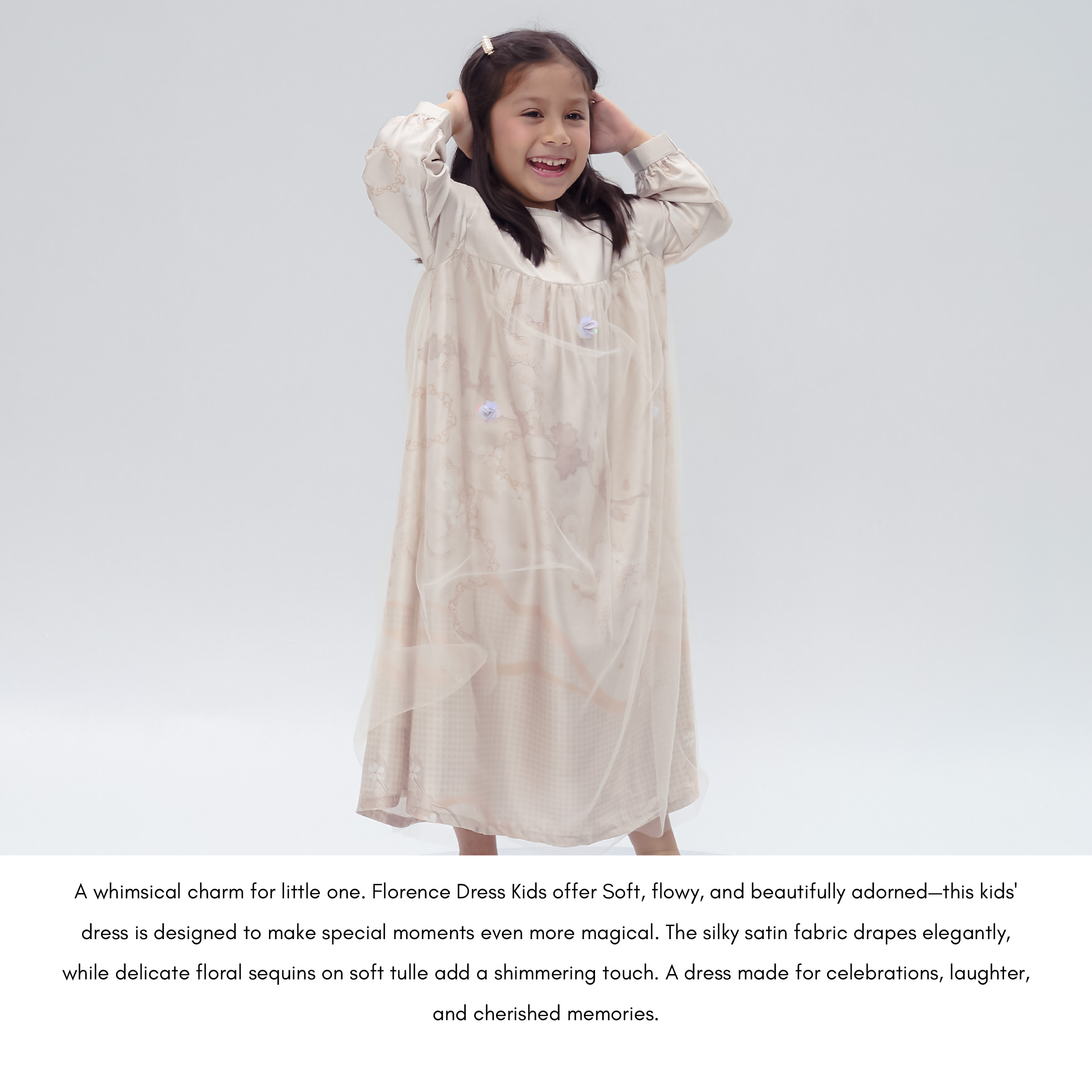 A whimsical charm for little one. Florence Dress Kids offer Soft, flowy, and beautifully adorned—this kids' dress is designed to make special moments even more magical. The silky satin fabric drapes elegantly, while delicate floral sequins on soft tulle add a shimmering touch. A dress made for celebrations, laughter, and cherished memories.