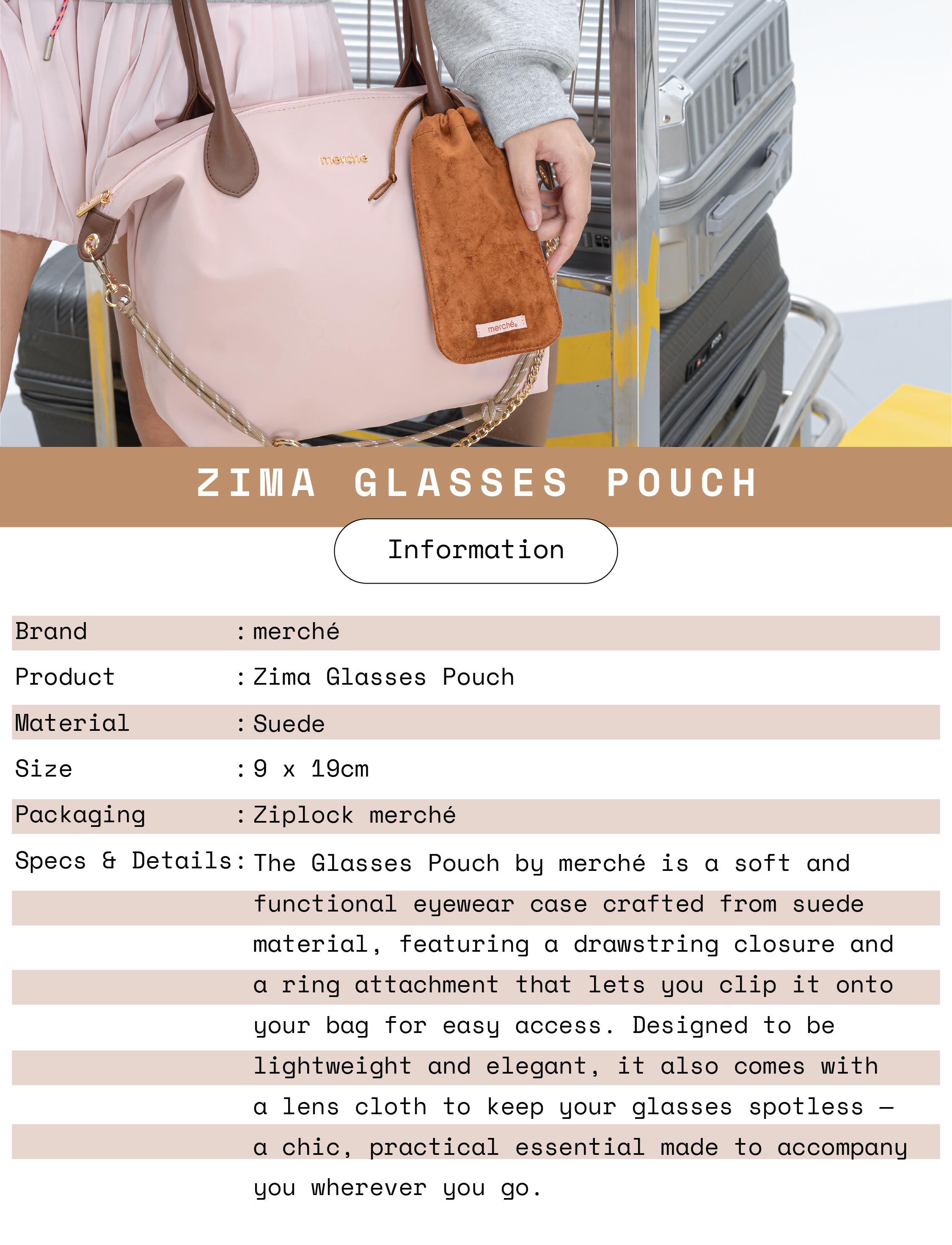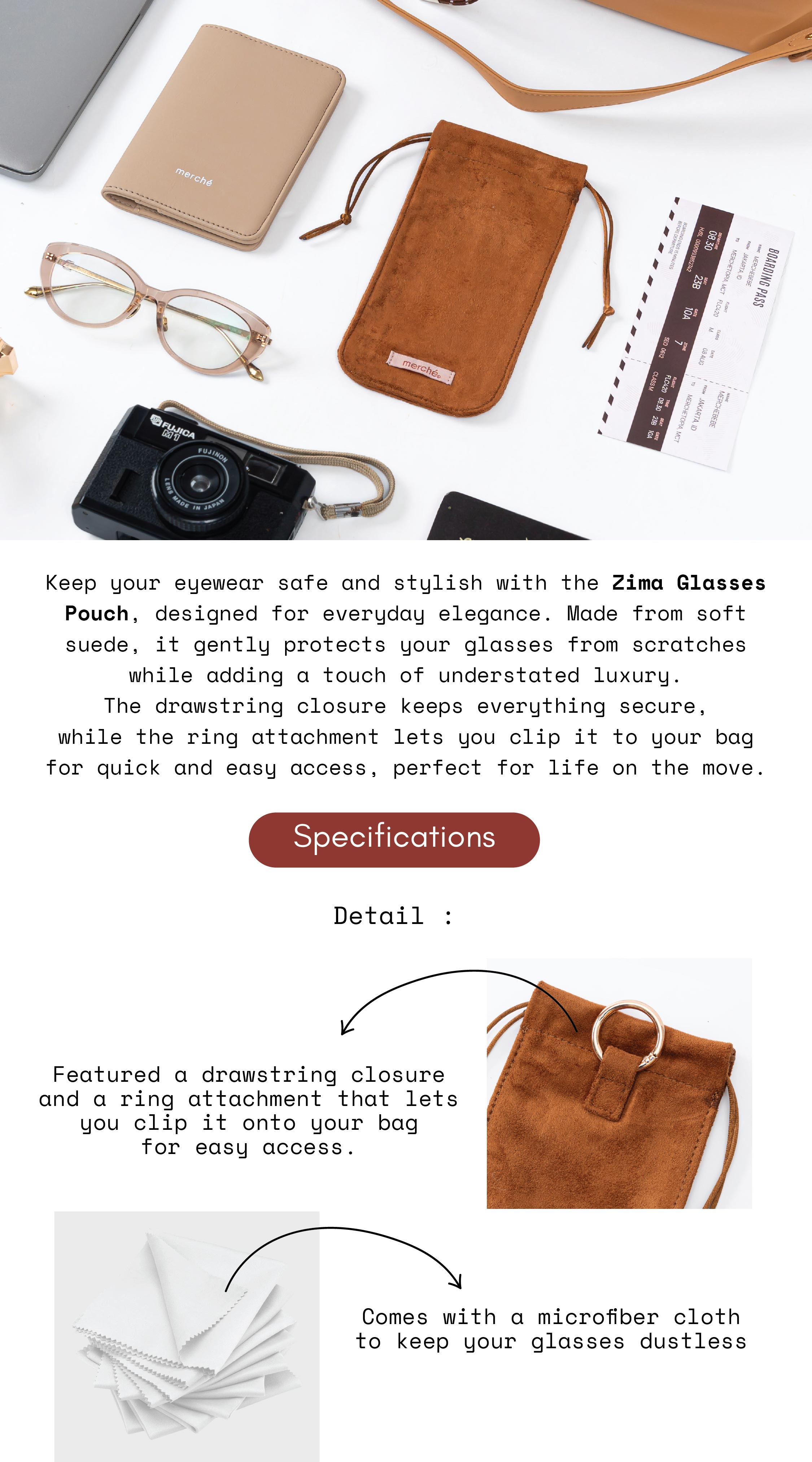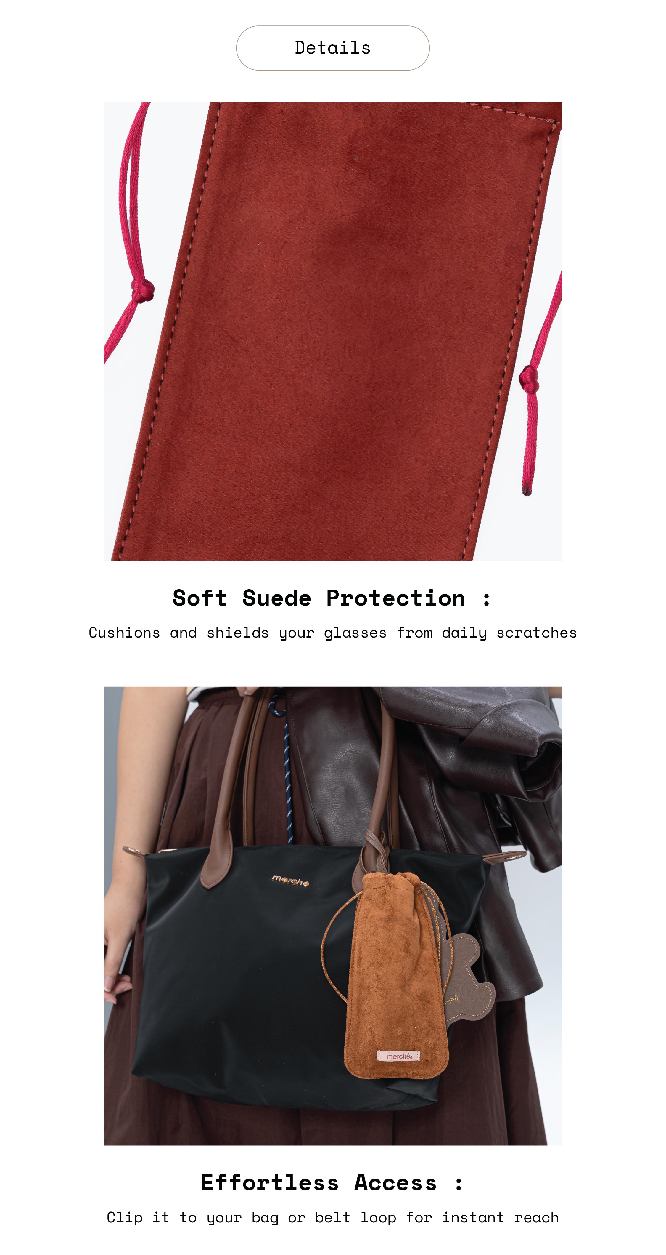 Keep your eyewear safe and stylish with the Zima Glasses Pouch, designed for everyday elegance. Made from soft suede, it gently protects your glasses from scratches while adding a touch of understated luxury. The drawstring closure keeps everything secure, while the ring attachment lets you clip it to your bag for quick and easy access, perfect for life on the move.